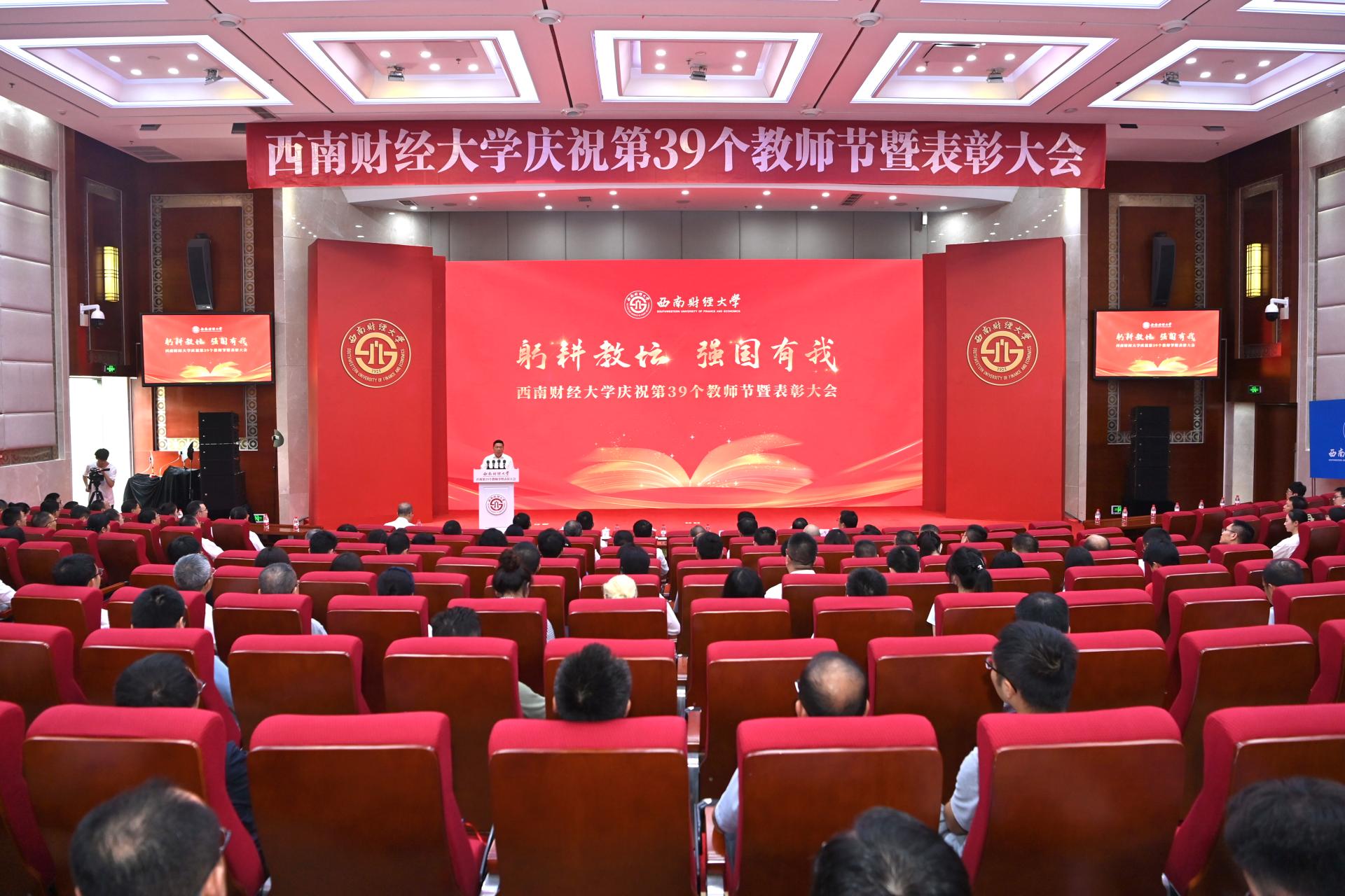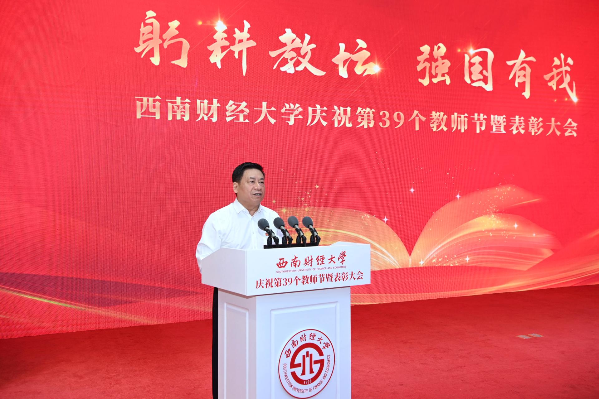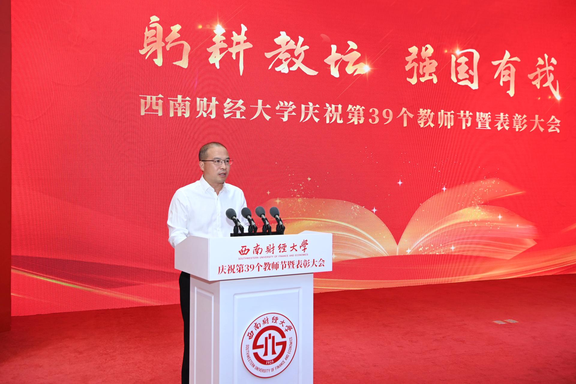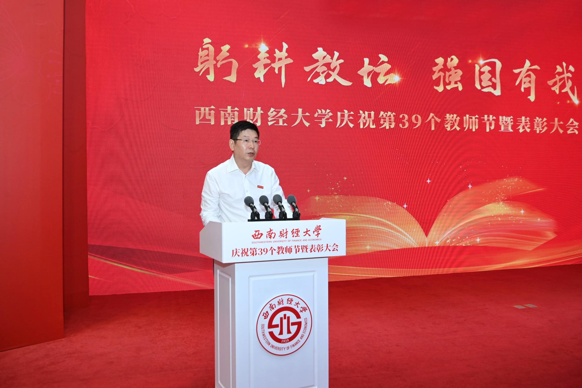 立德樹人育桃李,躬耕教壇擔(dān)使命。9月10日下午,西南財(cái)經(jīng)大學(xué)在弘遠(yuǎn)樓105會(huì)議室隆重舉行慶祝第39個(gè)教師節(jié)暨表彰大會(huì)。黨委書記趙德武,黨委副書記、校長李永強(qiáng),黨委副書記、紀(jì)委書記孫殿明,黨委常委、副校長尹慶雙、史代敏、桂富強(qiáng)、李志生,榮休教師和從教30年教職工代表,獲獎(jiǎng)集體和個(gè)人代表,職能教輔部門、學(xué)院(研究院)代表,統(tǒng)戰(zhàn)成員代表,外籍、港澳臺(tái)教師代表,離退休教職工及新入職教職工代表參加大會(huì)。李永強(qiáng)主持大會(huì)。