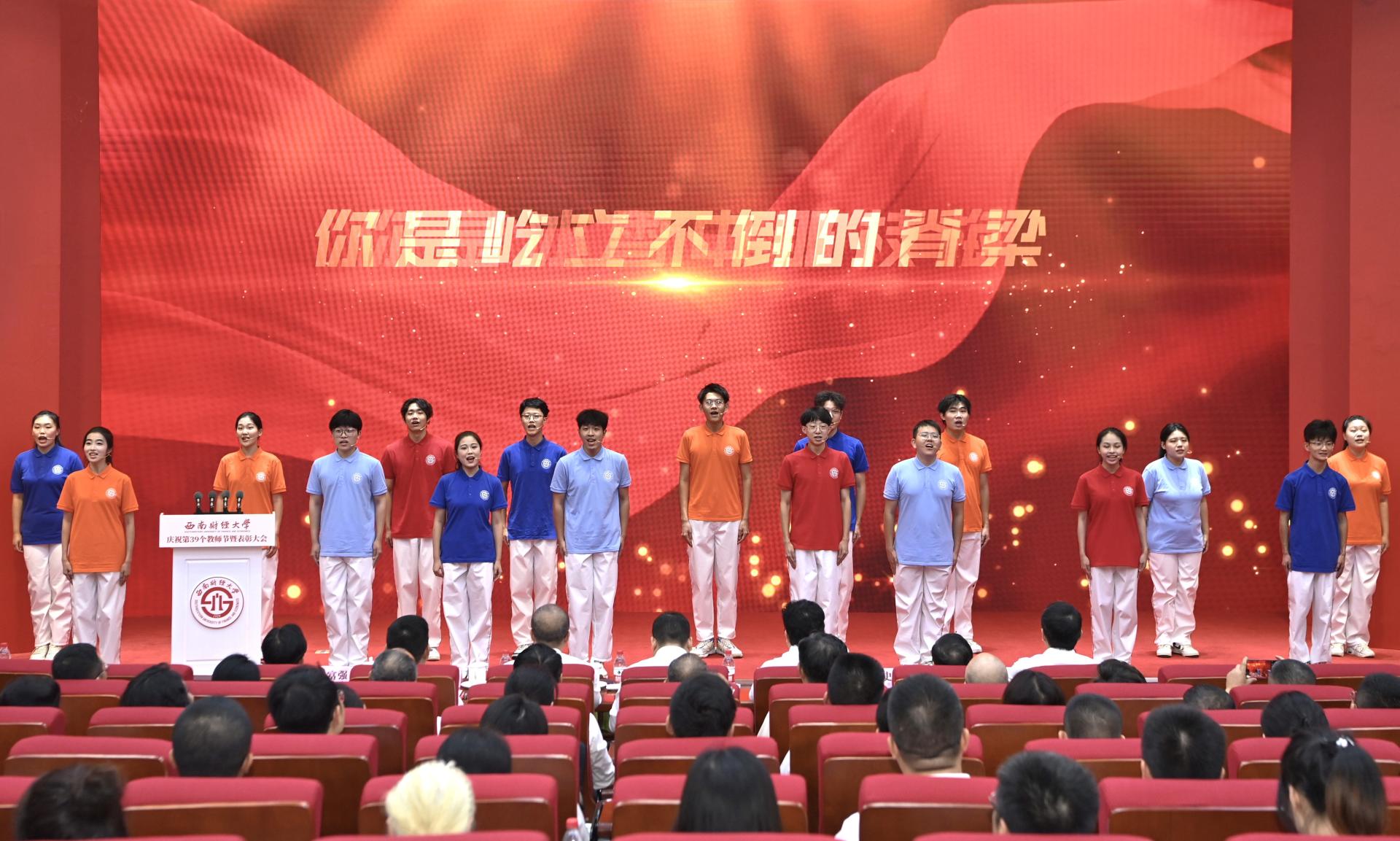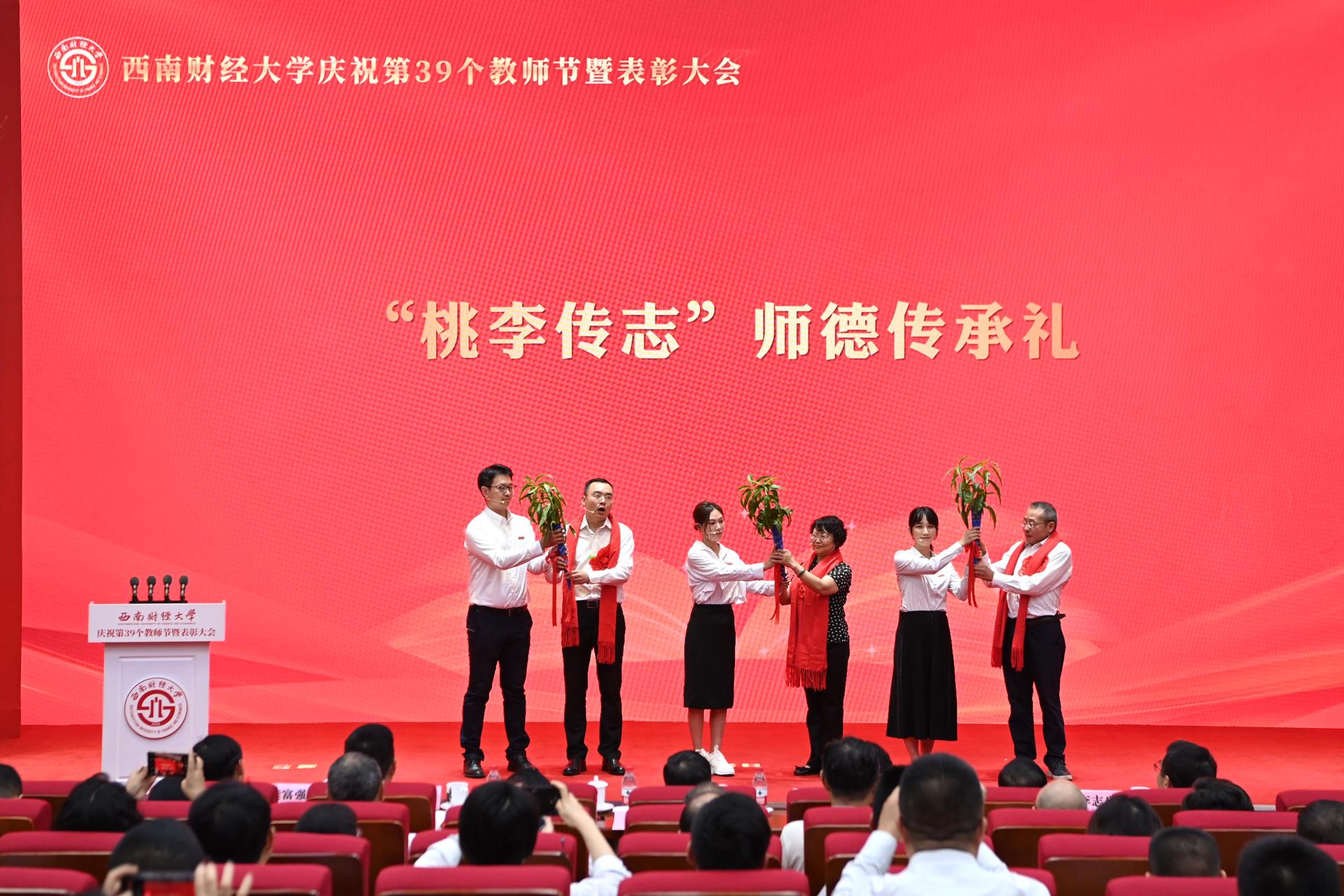 為傳承紅色基因,弘揚(yáng)西財(cái)精神,大會(huì)還特別舉行了“桃李傳志”師德傳承禮,榮休教師代表解春俠、從教30年教師代表余海宗、黃大年式教師團(tuán)隊(duì)負(fù)責(zé)人馬永強(qiáng)分享了各自立足自身崗位,樂于奉獻(xiàn)、奮力拼搏的經(jīng)歷和感悟,講述了各自見證的西財(cái)變遷、歲月如歌,并表示愿傾盡全力,為百年樹人大計(jì)貢獻(xiàn)力量,也期待后生群起,薪火相傳,書寫西財(cái)人教育報(bào)國新篇章。新入職教師代表劉佳怡、林燕玲、張陽表示將傳承前輩們的優(yōu)良傳統(tǒng),永葆教育初心使命,以滿腔的熱愛和不懈的奮斗來躬耕教壇,為譜寫中國式現(xiàn)代化教育西財(cái)篇章貢獻(xiàn)自己的力量。