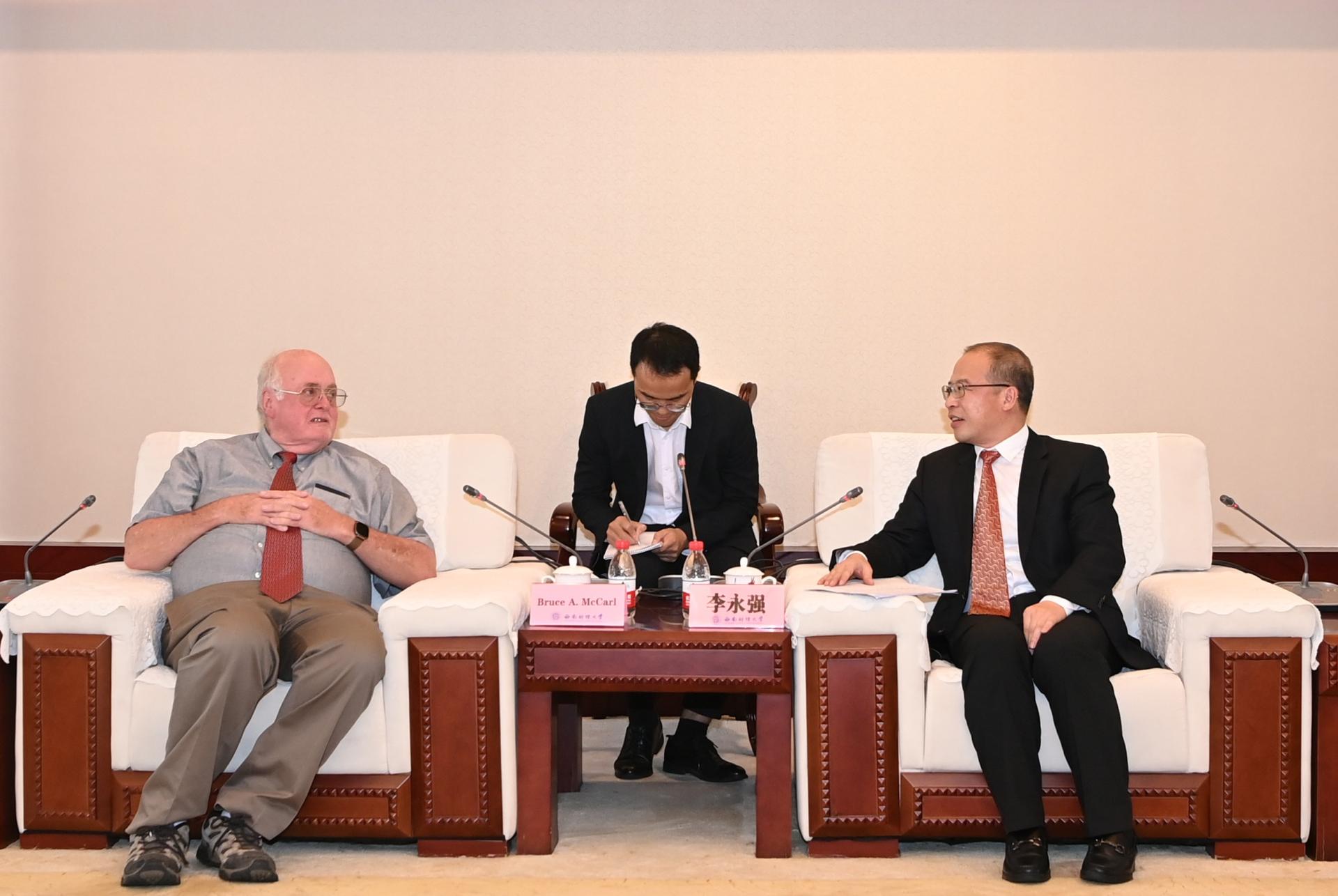 李永強(qiáng)對(duì)Bruce A. McCarl教授到訪(fǎng)表示熱烈歡迎。他詳細(xì)介紹了學(xué)校的歷史沿革、學(xué)科建設(shè)與發(fā)展戰(zhàn)略,重點(diǎn)介紹了學(xué)校全面推進(jìn)“新財(cái)經(jīng)”戰(zhàn)略升級(jí)的辦學(xué)實(shí)踐和改革探索。他表示,作為學(xué)校兩大集成創(chuàng)新平臺(tái)之一的“數(shù)字經(jīng)濟(jì)與交叉科學(xué)創(chuàng)新研究院”財(cái)經(jīng)科技集成創(chuàng)新平臺(tái)(園區(qū))聚焦解決財(cái)經(jīng)科技領(lǐng)域“卡脖子”問(wèn)題,積極開(kāi)展原創(chuàng)性引領(lǐng)性科技攻關(guān),著力構(gòu)建具有財(cái)經(jīng)特色的科技創(chuàng)新生態(tài)體系。 “雙碳數(shù)據(jù)開(kāi)發(fā)及能源安全研究團(tuán)隊(duì)”作為首批入駐團(tuán)隊(duì),長(zhǎng)期聚焦“雙碳”基礎(chǔ)數(shù)據(jù)庫(kù)開(kāi)發(fā)以及能源安全等問(wèn)題,致力于為全球氣候變化議題研究貢獻(xiàn)西財(cái)力量。期待Bruce A. McCarl教授積極助力學(xué)校高水平科技人才隊(duì)伍建設(shè),幫助團(tuán)隊(duì)產(chǎn)出更多高水平研究成果,不斷提升西財(cái)國(guó)際學(xué)術(shù)影響力和美譽(yù)度。同時(shí)也希望Bruce A. McCarl教授在“雙碳”領(lǐng)域以及經(jīng)濟(jì)管理領(lǐng)域的卓越學(xué)識(shí)能惠及我校更多師生。