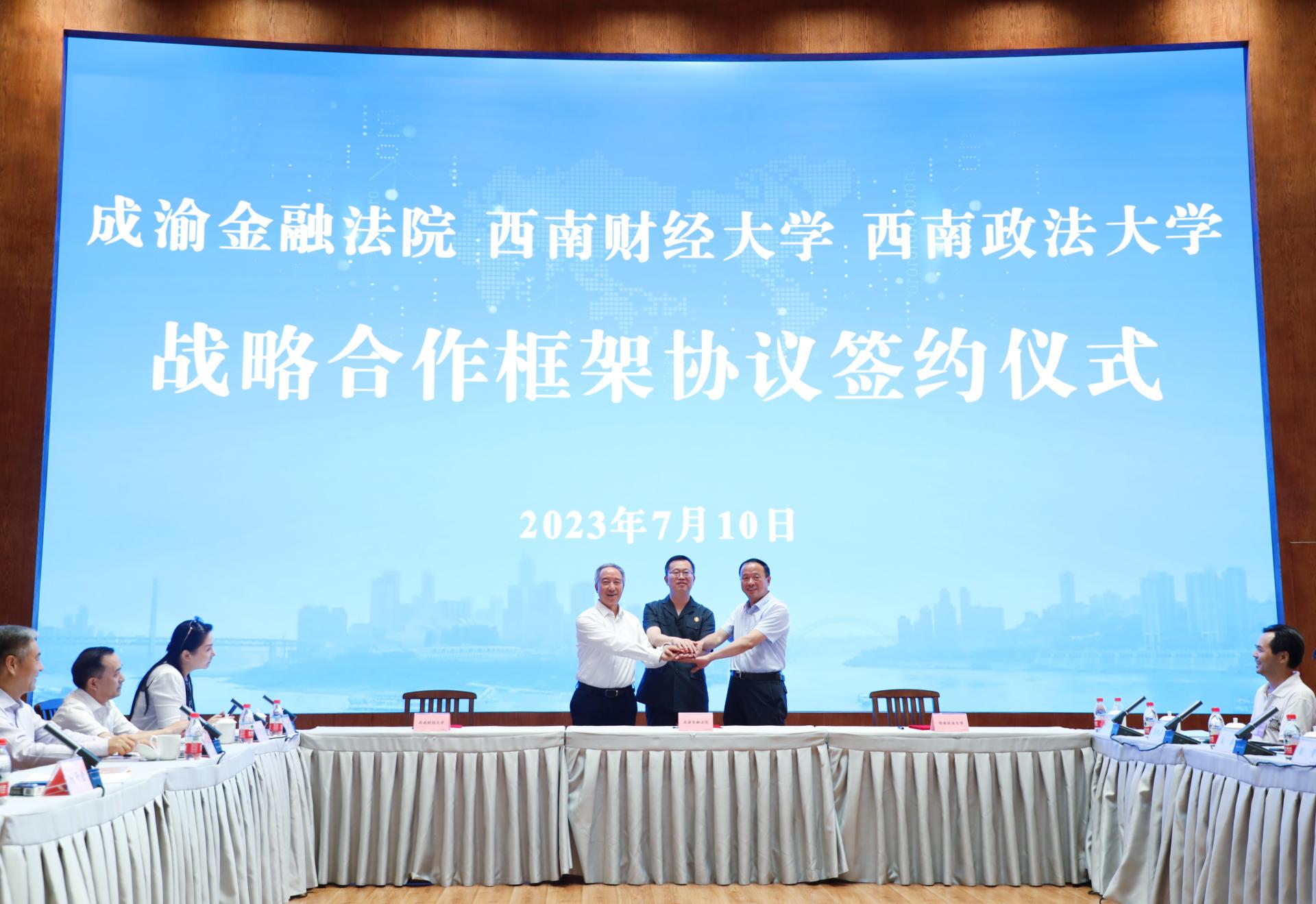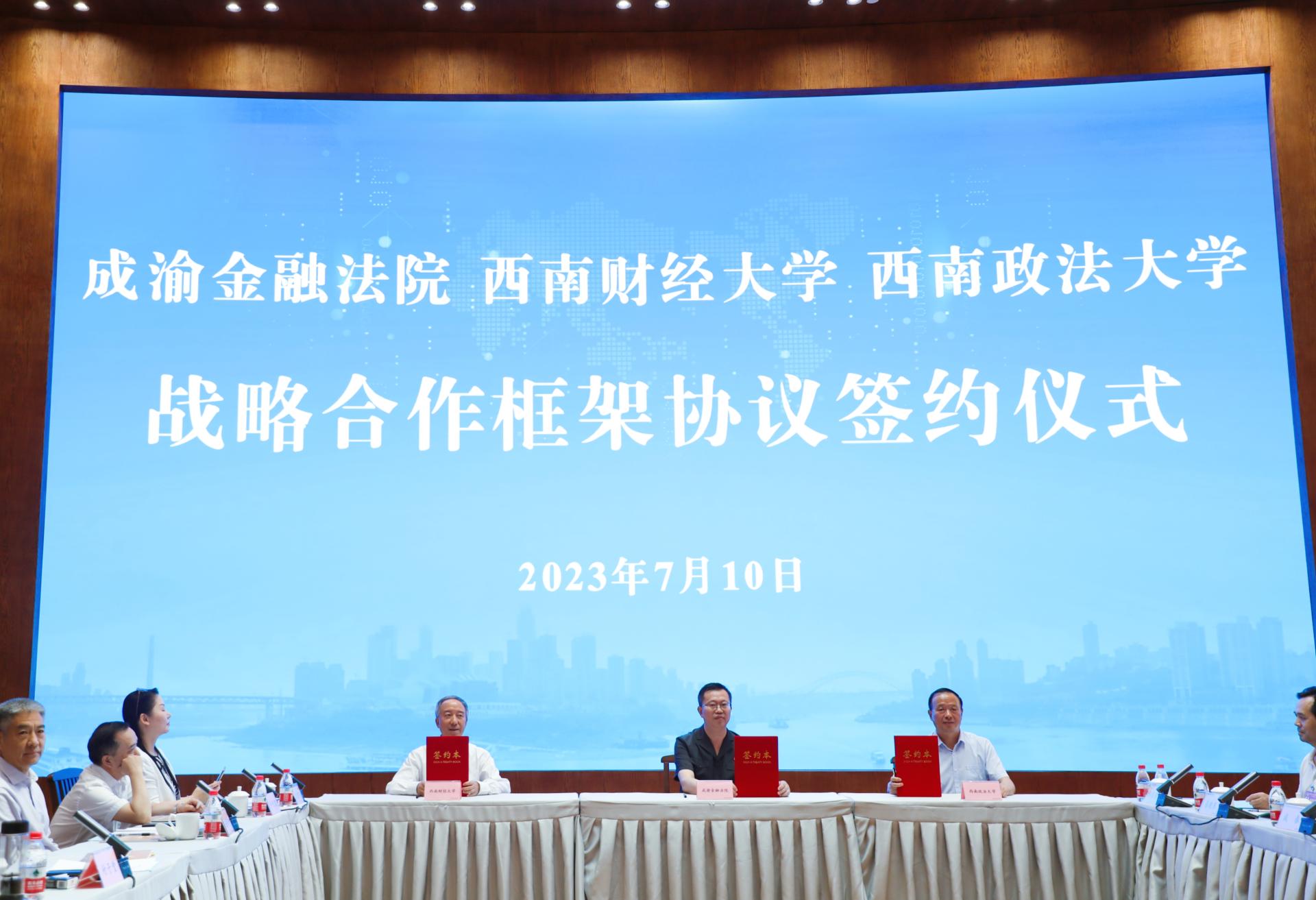 7月10日下午,成渝金融法院與西南財經(jīng)大學(xué)、西南政法大學(xué)《戰(zhàn)略合作框架協(xié)議》簽約儀式在成渝金融法院重慶辦公區(qū)舉行。西南財經(jīng)大學(xué)黨委副書記、校長卓志,重慶市高級人民法院黨組副書記、成渝金融法院黨組書記、院長何東寧,西南政法大學(xué)黨委副書記、校長付子堂出席簽約儀式。