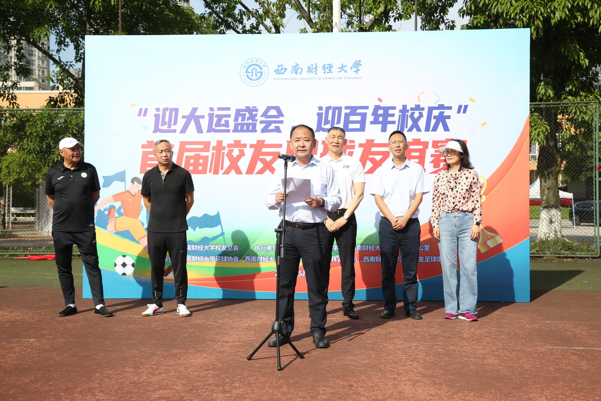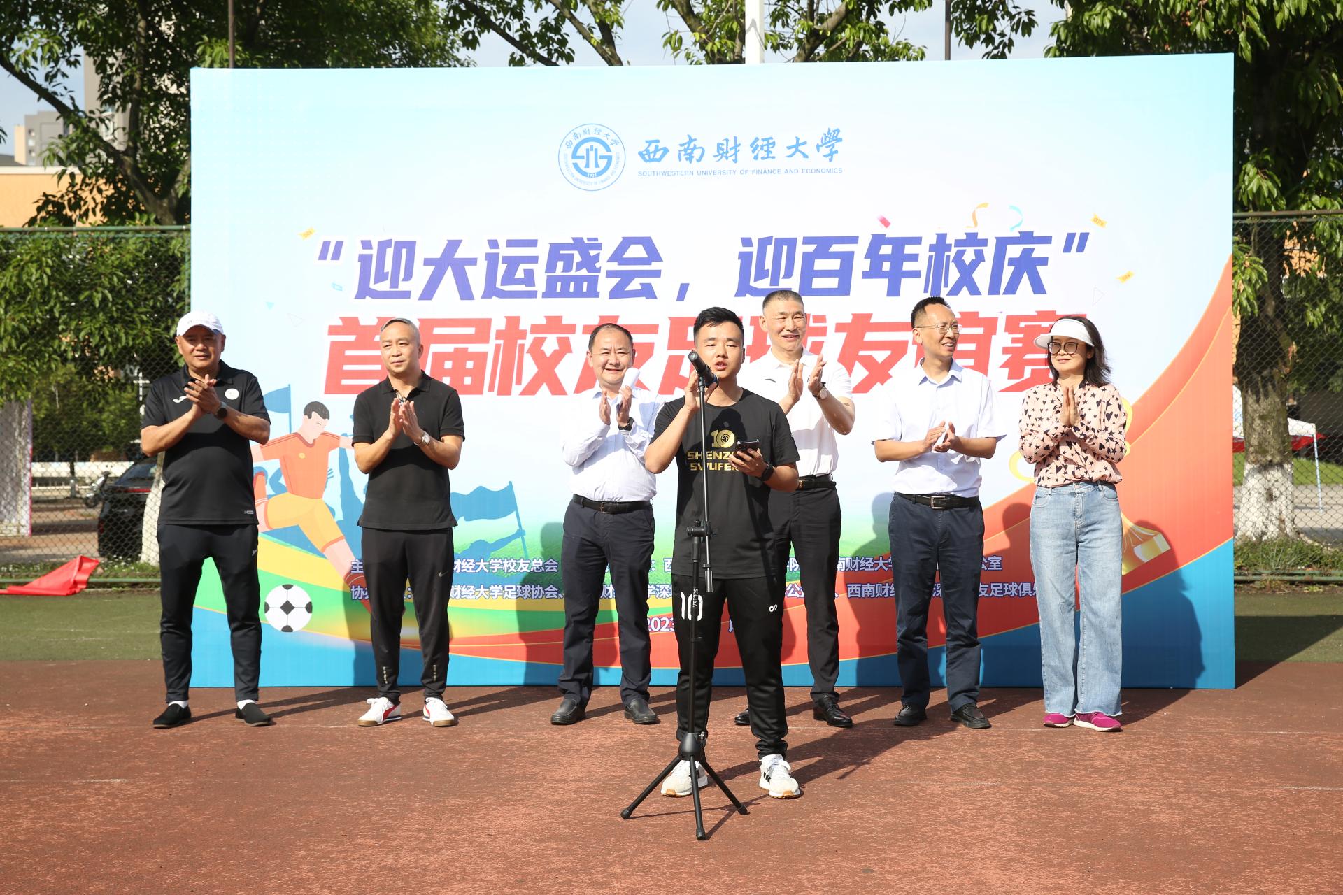 5月13日,由西南財經大學校友總會主辦,校友工作辦公室、體育學院承辦,西南財大足球協會、深圳校友會(光華柳林公益會)、深圳校友足球俱樂部協辦的“迎大運盛會,迎百年校慶”西南財經大學首屆校友足球友誼賽在柳林校區舉辦。黨委常委、副校長張邦富,校友工作辦公室、體育學院等單位負責人出席開幕式。來自北京、上海、重慶、廣西、深圳、貴州、成都七地的八支校友足球隊參賽,近200人齊聚朝暉運動場共享比賽盛況。