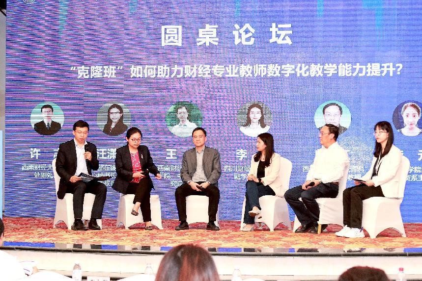 圓桌論壇環節,教育部在線教育研究中心秘書長、清華大學在線教育中心主任汪瀟瀟,我校金融學院院長王擎,四川財經職業學院金融學院副院長李琳,我校管理科學與工程學院教授帥青紅,長春財經學院金融學院投資系主任李元分別作為“克隆班”發起方代表、課程主要提供方代表、“克隆班”優秀組織單位代表、優秀教師代表和優秀學員代表,以“克隆班”如何助力財經專業教師數字化教學能力提升為主題,對“克隆班”教學形式、數字化教學創新、青年教師教學能力提升等進行了生動介紹,并展開深度討論,展現了“克隆班”這一融合式教學模式對教師數字化教學能力提升的助推作用。我校教務處副處長許志主持該環節。