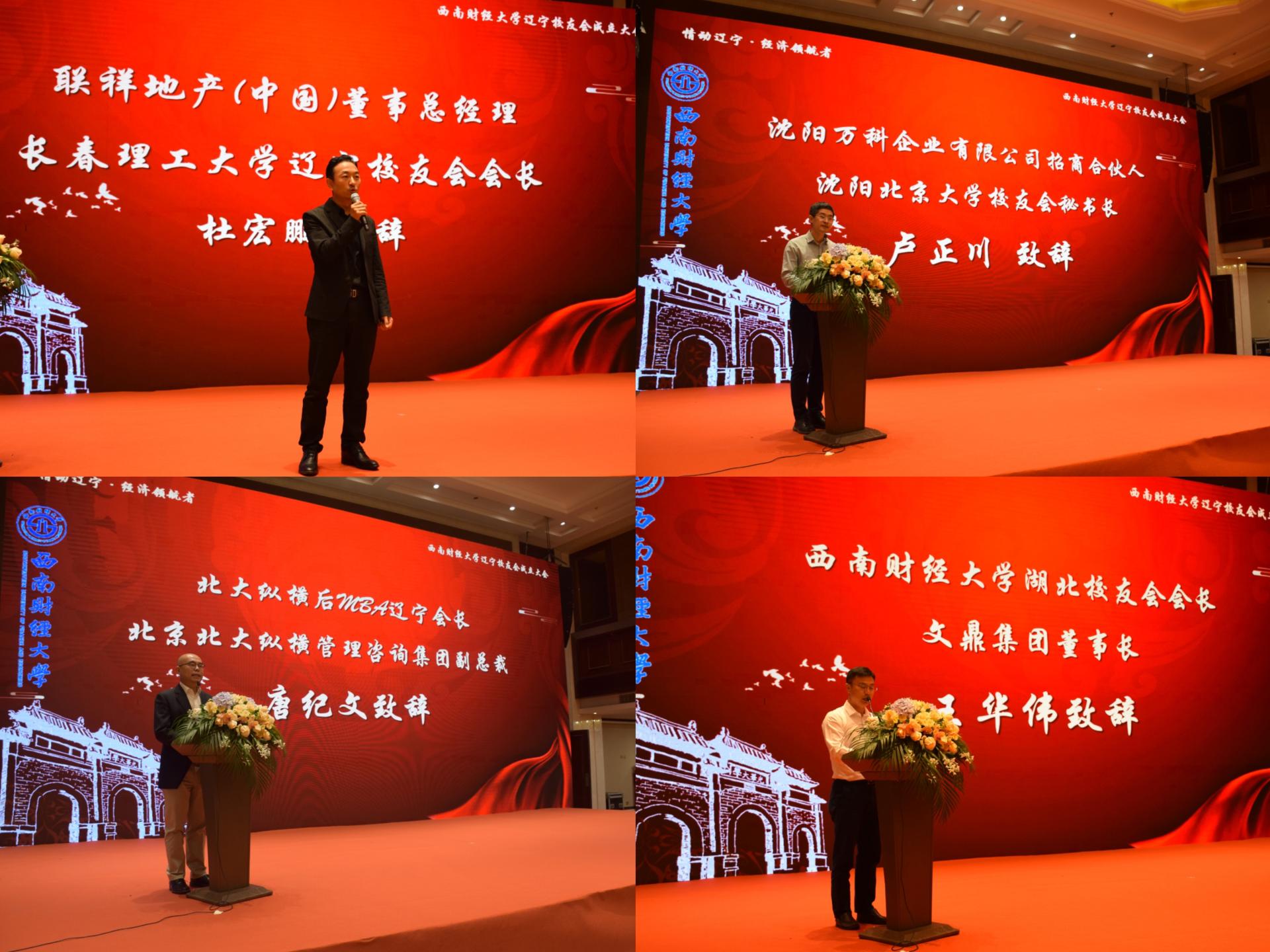 北京北大縱橫管理咨詢集團副總裁、資深合伙人唐紀文,沈陽萬科企業有限公司招商合伙人、沈陽北京大學校友會秘書長盧正川,文鼎集團董事長兼總裁、西南財經大學湖北校友會會長王華偉,聯祥地產(中國)董事總經理、長春理工大學遼寧校友會會長杜宏鵬先后發言,對西財遼寧校友會的成立表示祝賀。中國當代藝術家協會東北分會理事李德全老師為遼寧校友會贈送墨寶。