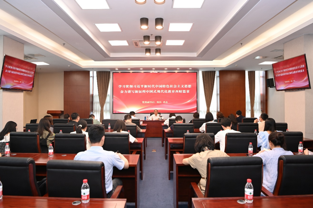 卓志指出,要全面落實實踐要求、落地生根。學(xué)思想的落腳點在于學(xué)思踐悟、融會貫通,要以全面貫徹落實習(xí)近平總書記關(guān)于教育的重要論述特別是關(guān)于建設(shè)教育強國的重要論述為抓手,著力回答好“強國建設(shè)、教育何為”“教育強國、西財何為”等重大命題。要深刻把握經(jīng)濟高質(zhì)量發(fā)展、科技革命、教育變革的迫切要求,瞄準(zhǔn)更好建構(gòu)中國自主知識體系、支撐高水平科技自立自強和培養(yǎng)國家急需人才,全面推動“新財經(jīng)”戰(zhàn)略升級,著力推進一流學(xué)科培優(yōu)、財經(jīng)科技創(chuàng)新、人才引領(lǐng)支撐,推動以高等教育為龍頭的高質(zhì)量教育體系建設(shè),加快建設(shè)財經(jīng)特色鮮明的世界一流大學(xué),奮力寫好新征程中國式現(xiàn)代化教育西財篇章。