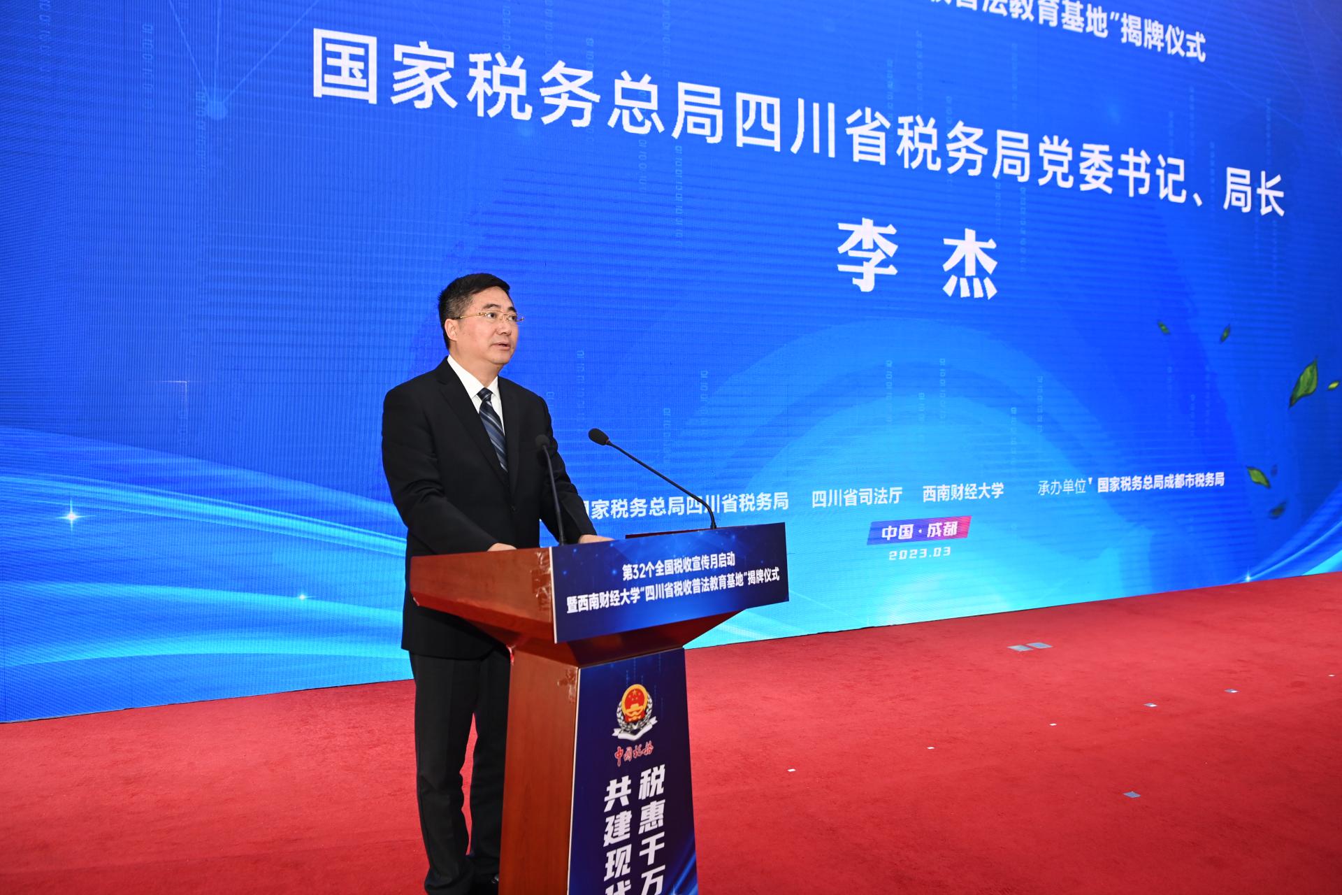 3月30日,第32個全國稅收宣傳月啟動暨“四川省稅收普法教育基地”揭牌儀式在我校舉行,以“稅惠千萬家 共建現代化”為主題的稅收宣傳月活動正式啟動。四川省稅務局黨委書記、局長李杰,四川省司法廳二級巡視員王勤,四川省稅務局黨委副書記、成都市稅務局黨委書記、局長李杰生,四川省稅務局黨委委員、總經濟師白冰;我校黨委副書記、校長卓志,黨委副書記馬驍,黨委常委、副校長桂富強出席儀式。