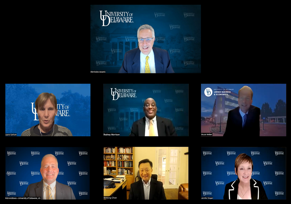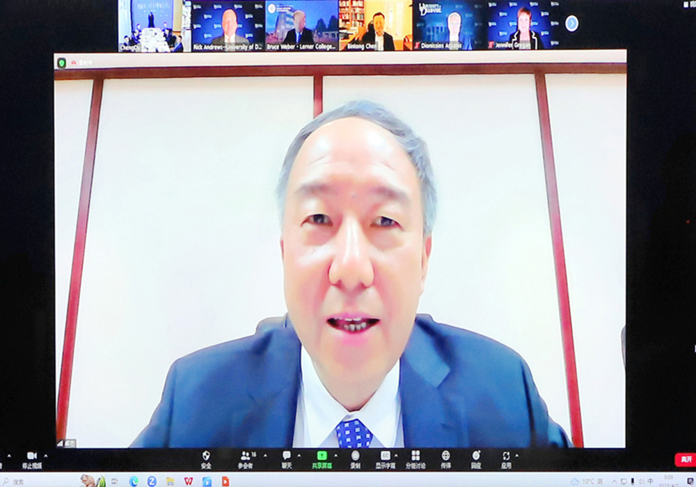 聯(lián)合管理委員會(huì)主席卓志在線發(fā)表致辭。他表示,特拉華大學(xué)是我校非常重視和珍惜的合作伙伴,兩校三年來(lái)密切協(xié)作克服疫情帶來(lái)的困難,保障了各項(xiàng)教學(xué)任務(wù)順利完成,學(xué)院發(fā)展取得重要突破。當(dāng)前新一輪科技革命和產(chǎn)業(yè)變革孕育興起,特別是AI技術(shù)發(fā)展迅猛,我校以科技創(chuàng)新為“新財(cái)經(jīng)”戰(zhàn)略升級(jí)賦能,希望學(xué)院找準(zhǔn)與“新財(cái)經(jīng)”戰(zhàn)略升級(jí)的結(jié)合點(diǎn)和切入點(diǎn),突出數(shù)據(jù)科學(xué)培養(yǎng)特色,努力把學(xué)院打造成為“新財(cái)經(jīng)”人才培養(yǎng)的國(guó)際化示范區(qū)。