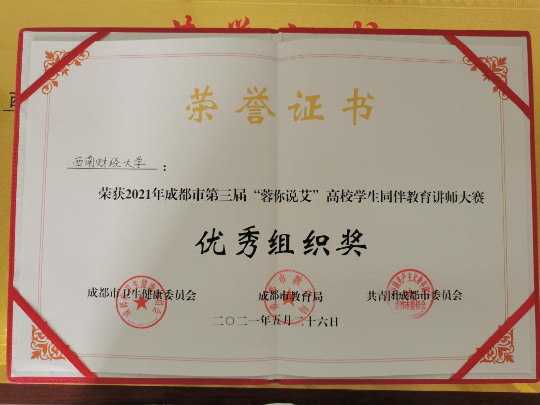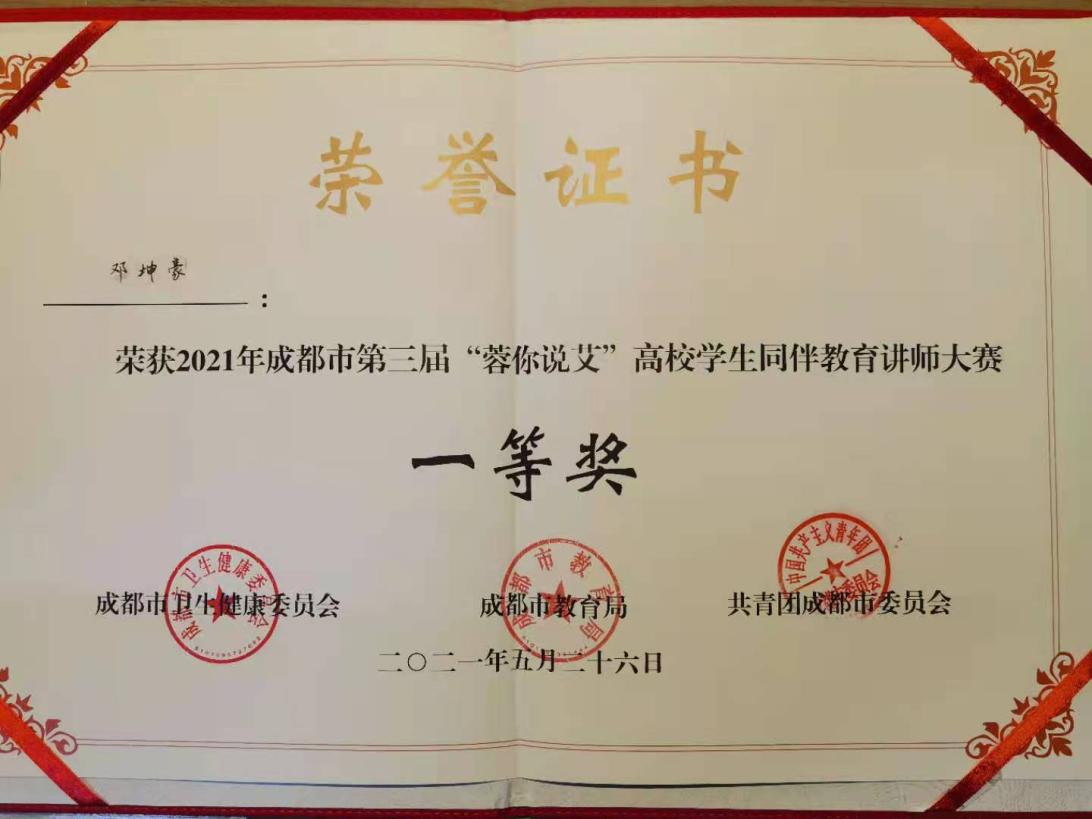 5月26日,由成都市衛健委、成都市教育局、共青團成都市委主辦的成都市第三屆“蓉你說艾”高校學生艾滋病防治同伴教育講師大賽在成都工業學院舉行。由我校紅十字會選送的2019級金融學院鄧坤豪同學與來自四川大學、電子科技大學等在蓉40余所大中專院校選手同臺競技,發揮出色,榮獲大賽一等獎。我校還獲得“優秀組織獎”榮譽。