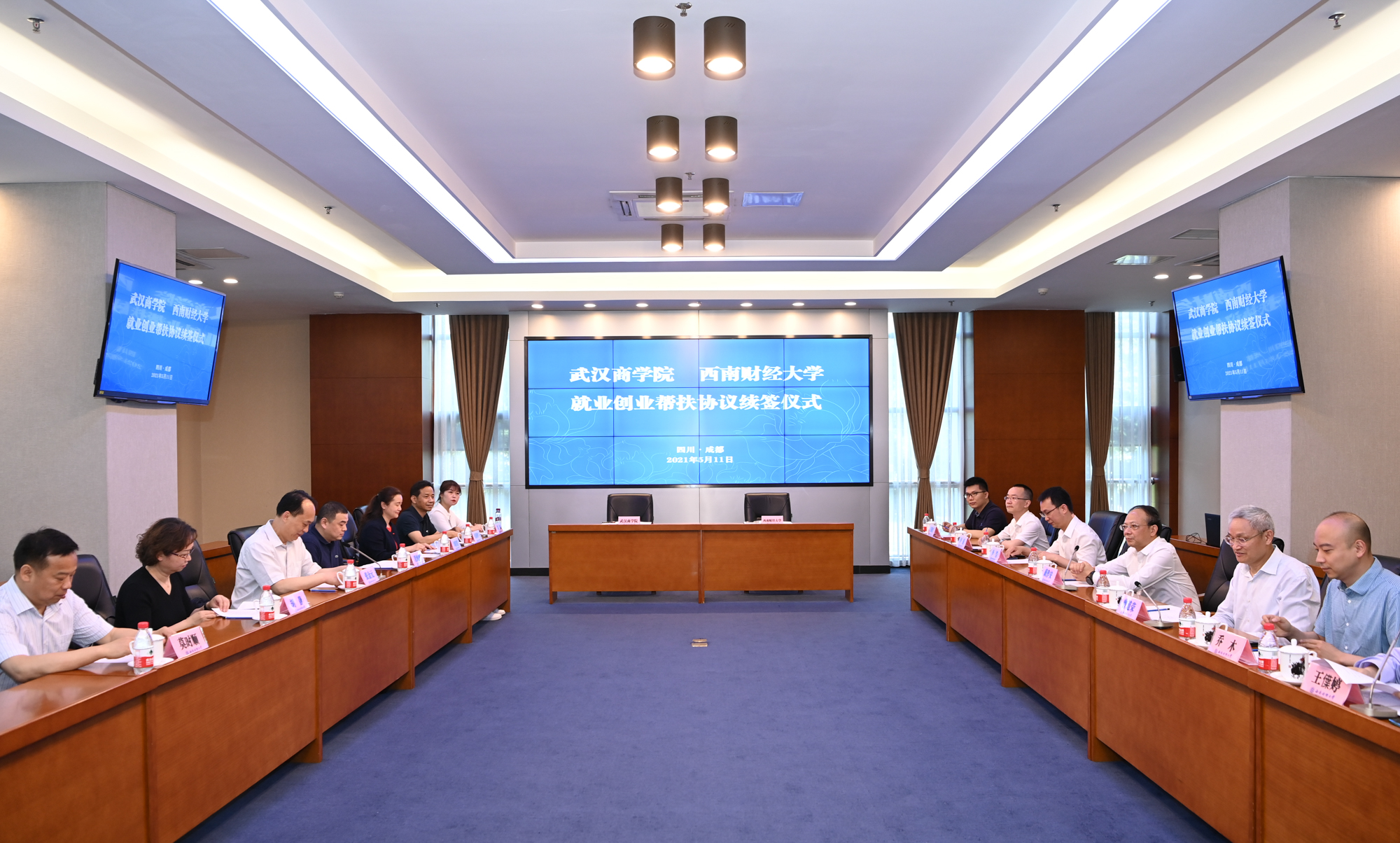 5月11日上午,西南財經大學與武漢商學院就業創業幫扶協議續簽儀式在柳林校區弘遠樓109會議室舉行。校黨委副書記曾道榮、武漢商學院副校長劉佳霓代表兩校簽訂了協議。湖北省教育廳副廳長張金元、四川省教育廳副廳長戴作安及相關負責同志見證了簽約儀式。