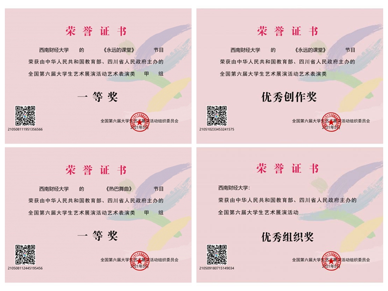 5月6日至12日,全國第六屆大學(xué)生藝術(shù)展演活動在成都城市音樂廳盛大舉行。我校藝術(shù)團(tuán)交響樂團(tuán)的樂器合奏《熱巴舞曲》、舞蹈團(tuán)舞蹈節(jié)目《永遠(yuǎn)的課堂》分別以所在組別四川省一等獎的優(yōu)異成績?nèi)雵珖寡荩渲形璧腹?jié)目《永遠(yuǎn)的課堂》應(yīng)邀參加開幕式演出。12日傳來喜訊,2個(gè)展演節(jié)目雙雙獲全國金獎,學(xué)校獲優(yōu)秀組織獎,《永遠(yuǎn)的課堂》獲優(yōu)秀創(chuàng)作獎共四項(xiàng)大獎,創(chuàng)學(xué)校有史以來最好成績。本次大藝節(jié)再一次集中展示了學(xué)校聚焦美育工作、打造西財(cái)美育文化取得的良好育人成效和豐碩成果,傳遞了西財(cái)青年的文化自信和理想追求。