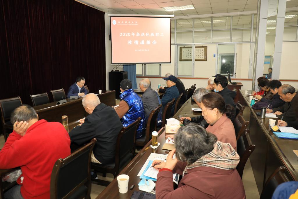 11月4日上午,學(xué)校在光華離退休活動(dòng)中心召開(kāi)離退休教職工校情通報(bào)會(huì)。受黨委書(shū)記趙德武和校長(zhǎng)、黨委副書(shū)記卓志委托,黨委副書(shū)記馬驍向離退休老同志通報(bào)了2020年學(xué)校主要工作。離退休黨總支委員、支部書(shū)記、支委,行政小組負(fù)責(zé)人及離退休教職工代表參加了會(huì)議,會(huì)議由離退休工作處處長(zhǎng)劉明杰主持。