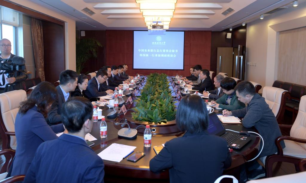 11月11日,中國(guó)農(nóng)業(yè)銀行總行董事會(huì)秘書(shū)韓國(guó)強(qiáng)等一行來(lái)校調(diào)研。黨委書(shū)記趙德武,校長(zhǎng)、黨委副書(shū)記卓志,黨委常委、副校長(zhǎng)尹慶雙,校長(zhǎng)辦公室、發(fā)展規(guī)劃處、科研處、財(cái)務(wù)處等部門(mén)負(fù)責(zé)人在騰驤樓604會(huì)議室與來(lái)賓舉行座談。尹慶雙主持座談。