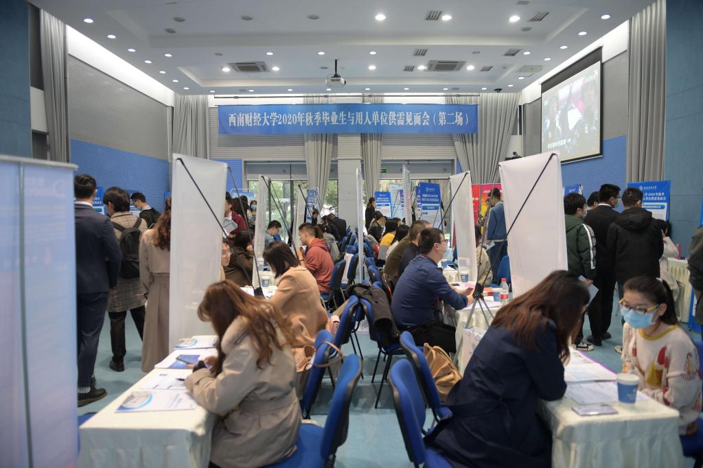 11月20日,西南財經(jīng)大學(xué)2020年第二場畢業(yè)生與用人單位供需見面會在柳林校區(qū)學(xué)生活動中心舉行。來自四川、廣東、北京、江蘇等17個省市的101家用人單位齊聚我校廣攬英才,提供就業(yè)實習(xí)崗位2186個,吸引了2000余名應(yīng)往屆畢業(yè)生參會。