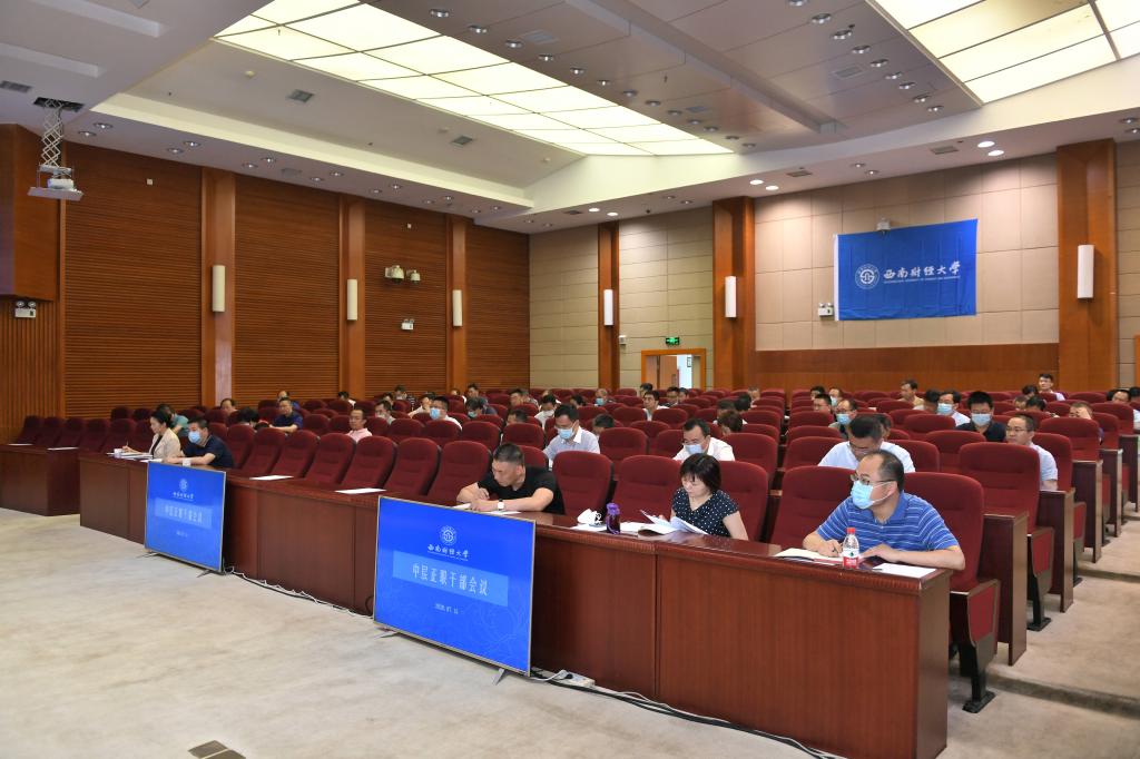 7月15日,學校在騰驤樓137會議室召開中層正職干部會議,總結春季學期工作,安排部署期末及秋季學期開學工作。黨委書記趙德武,校長、黨委副書記卓志,黨委副書記馬驍、曾道榮,黨委常委、副校長尹慶雙、史代敏、張邦富、李永強,學校擔任實職的全體中層正職干部參加會議。趙德武主持會議。