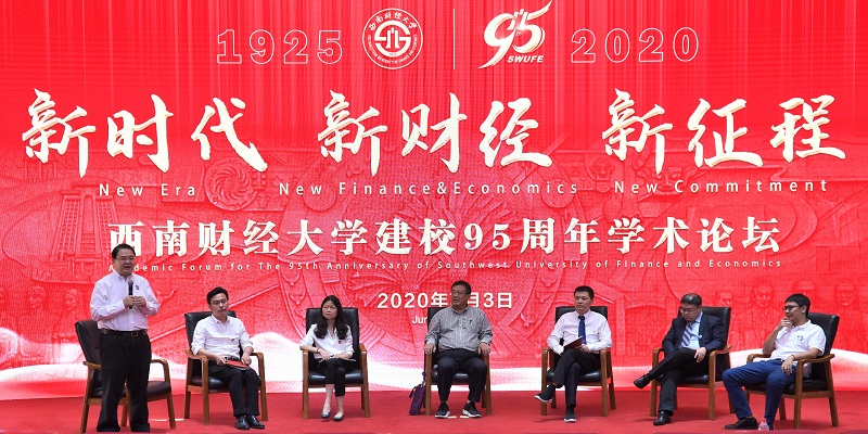 6月3日下午,學校在弘遠樓105會議室隆重舉行建校95周年學術論壇。教育部原黨組成員、社科委副主任、北京大學顧海良教授,中國人民大學副校長劉元春教授,中央財經大學校長王瑤琪教授,上海財經大學校長蔣傳海教授,國家自然科學基金委管理學部原副主任、天津大學張維教授,對外經濟貿易大學原副校長、國家對外開放研究院執行院長林桂軍教授,四川省政協原副主席解洪教授,我校中國金融研究中心名譽主任曾康霖教授,成都市社科聯主席、我校成渝經濟區發展研究院院長楊繼瑞教授,學校領導班子全體成員、師生和校友代表等百余人參加論壇。黨委書記趙德武致辭,校長、黨委副書記卓志作主旨演講。論壇以線上線下相結合的方式舉行。
