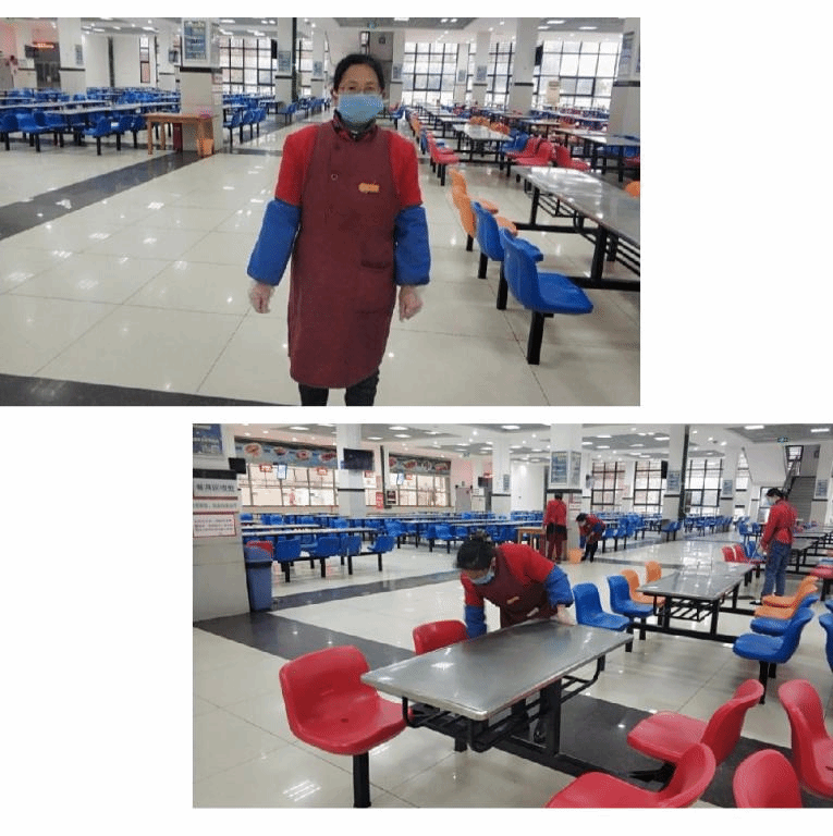 李素英是五谷堂清潔組的成員,為了保證留校師生員工的生命安全與身體健康,防疫期間的清潔工作相較于平時要嚴格數倍,李素英每天也需要花更多的時間進行至少兩次的食堂桌面、地面和設施消毒殺菌,并完成每日消毒詳細記錄,做到清潔工作不留死角,堅決保證留校師生員工就餐環境安全。與李素英相同,她的愛人也是西財留校的安保組成員,主要負責維護校園日常秩序,兩人各自在不同的工作崗位為學校防疫工作而努力。雖然身在同在一個校區,但由于工作地點不同夫妻二人很少見面。李素英在五谷堂努力做好消毒殺菌保障師生員工就餐安全,丈夫在校園內負責安全巡邏為留校師生員工的安全而堅定守護,防疫工作任務重內容多,兩人都一心撲在工作上,幾天也未必能見上一面。每當李素英想丈夫的時候,她會想到自己的愛人和自己一樣也在校內另一處努力著。