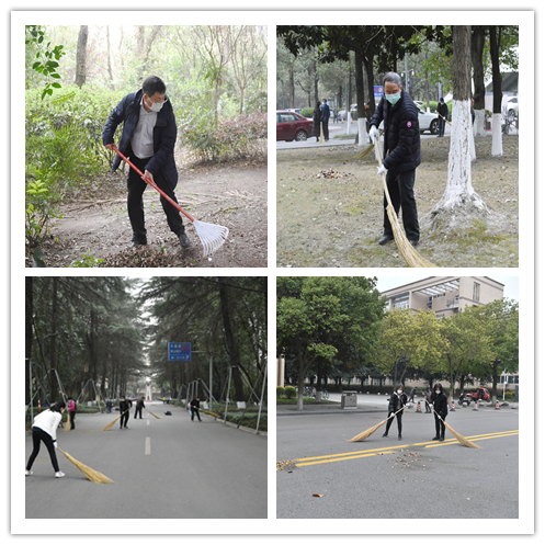 上午九點半,黨委書記趙德武,校長、黨委副書記卓志分別帶領校領導班子成員、中層干部和師生代表,戴好口罩,戴上手套,拿起工具,對兩校區公共區域實行分組包干大掃除。清潔地面、清理落葉、清除淤泥、清掃垃圾,20個工作組分片、分散勞動,合力打掃校園主干道、綠化帶、校內水域、學生宿舍、停車場等室外區域,細致消毒宿舍、食堂、辦公室、廁所等室內場所,作業區域覆蓋教職工辦公室、留校學生公寓、職工宿舍、食堂、廣場、廁所、地下排水溝渠等,維護校內環境衛生、干凈、整潔,校園里隨處可見埋頭苦干、揮汗如雨的賣力身影。