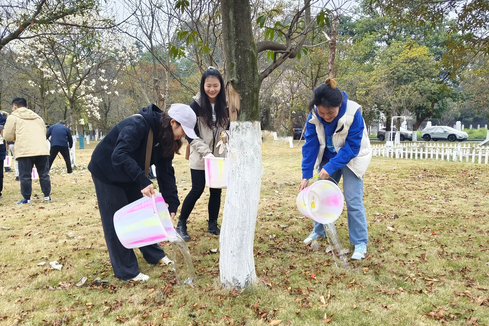 下午兩點,植樹護樹活動在兩校區同時舉行。柳林校區詩白書院南側,師生們三五人一組,團結協作干勁十足,揮舞鐵鍬、鏟土挖坑、踏土夯實、覆土平整……勞動現場有條不紊,各個環節銜接有序。經過師生近一個小時的辛勤勞作,88株重瓣晚櫻迎風而立,為美麗校園增添了一道生機盎然的風景線。光華校區光華樓西側草坪,師生們擼起袖子拎起水桶,認真細致地為每一株樹木施肥澆水,一株株銀杏、杜英、玉蘭在和煦春風中享受涓涓清流的澆灌,煥發出勃勃生機。