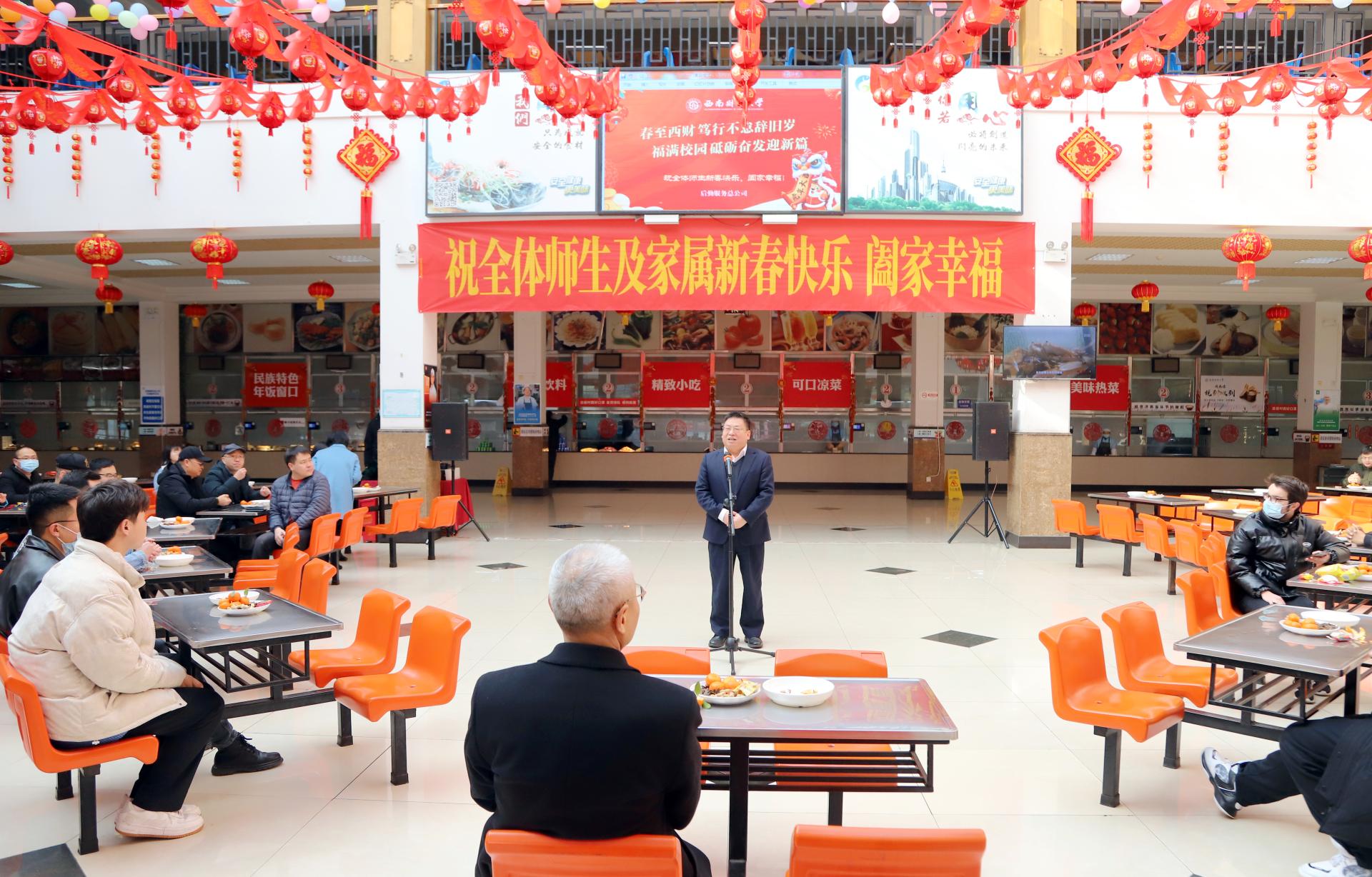 金牛辭歲寒風盡,玉虎迎春喜氣來。在做好常態化疫情防控的前提下, 1月31日中午,學校在柳林校區三味堂一樓舉行2022年寒假留校學生新春團拜會。黨委書記趙德武、黨委副書記曾道榮,相關職能部門和各學院(中心)負責人與200余名寒假留校同學歡聚一堂、喜迎佳節,讓同學們在學校感受“過新年”的熱鬧喜慶氛圍,享受“家”的味道。