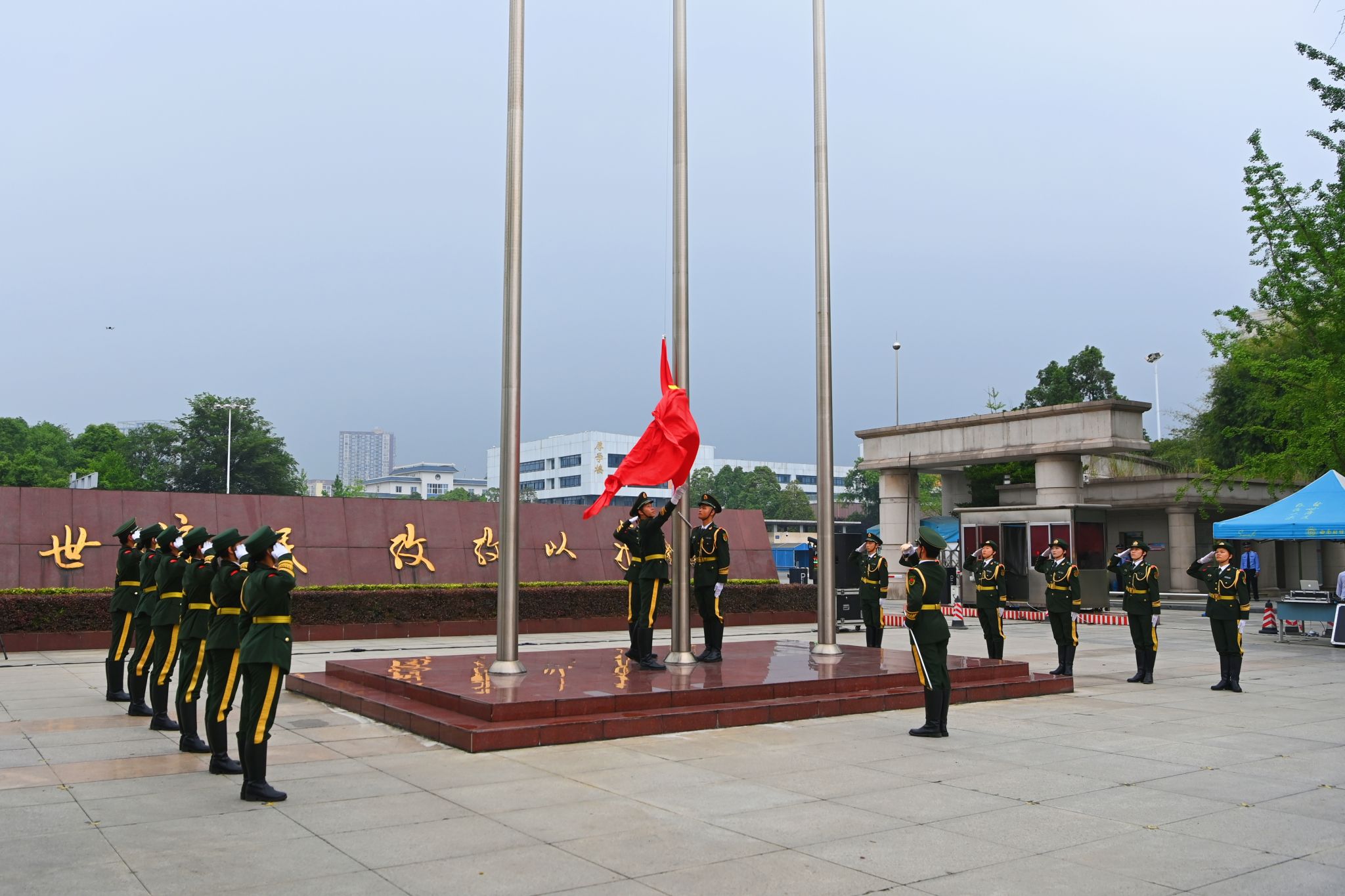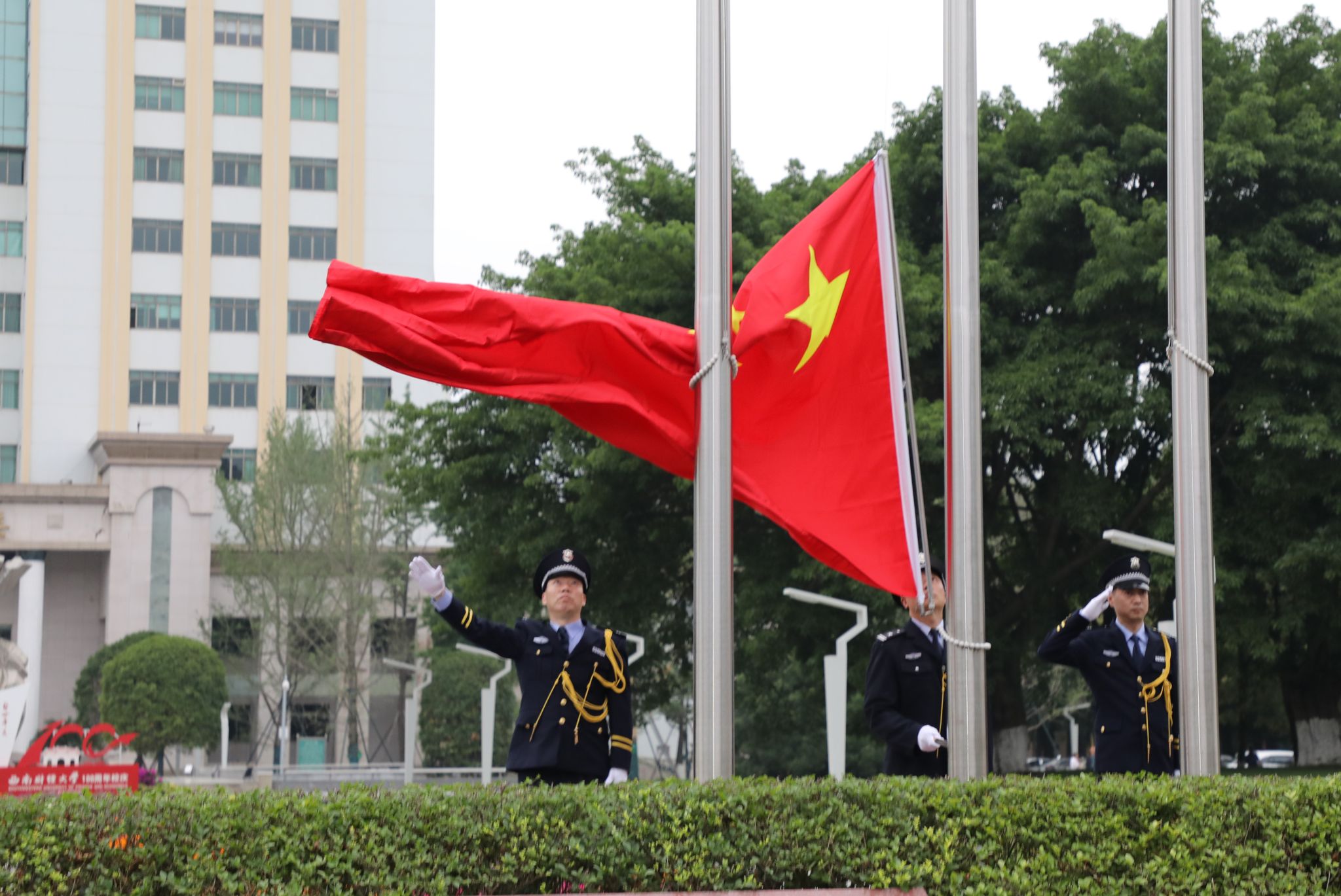 黃浦浣花,草木承澤。6月3日,伴隨著溫煦的晨風(fēng),學(xué)校在光華校區(qū)、柳林校區(qū)同時(shí)舉行建校99周年紀(jì)念日升國旗儀式。師生們齊聚兩校區(qū)北大門廣場,共同見證這一莊嚴(yán)神圣又喜悅溫馨的時(shí)刻。全體校領(lǐng)導(dǎo)、師生代表、校衛(wèi)隊(duì)員、國旗班成員參加儀式。