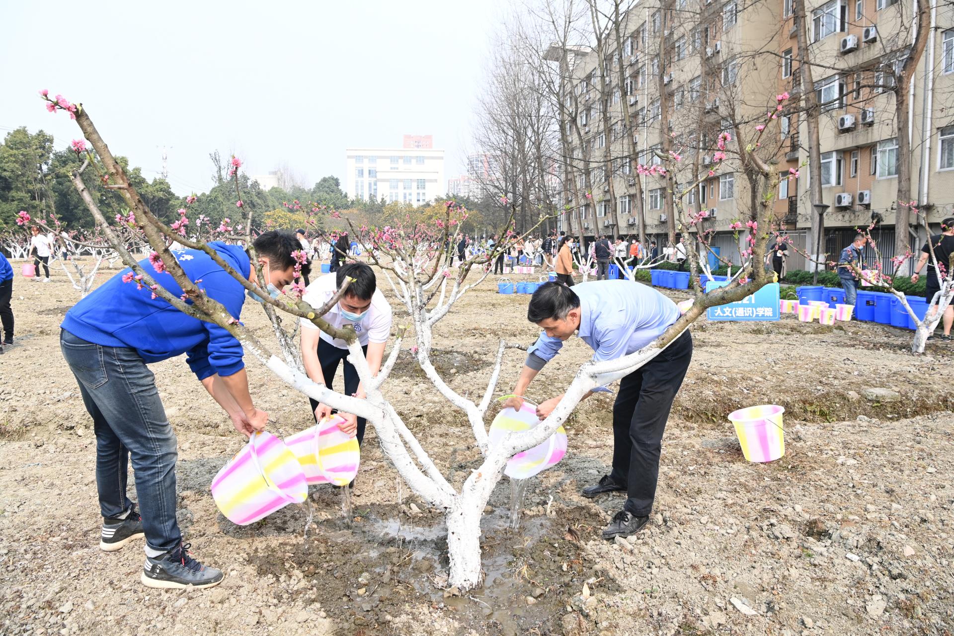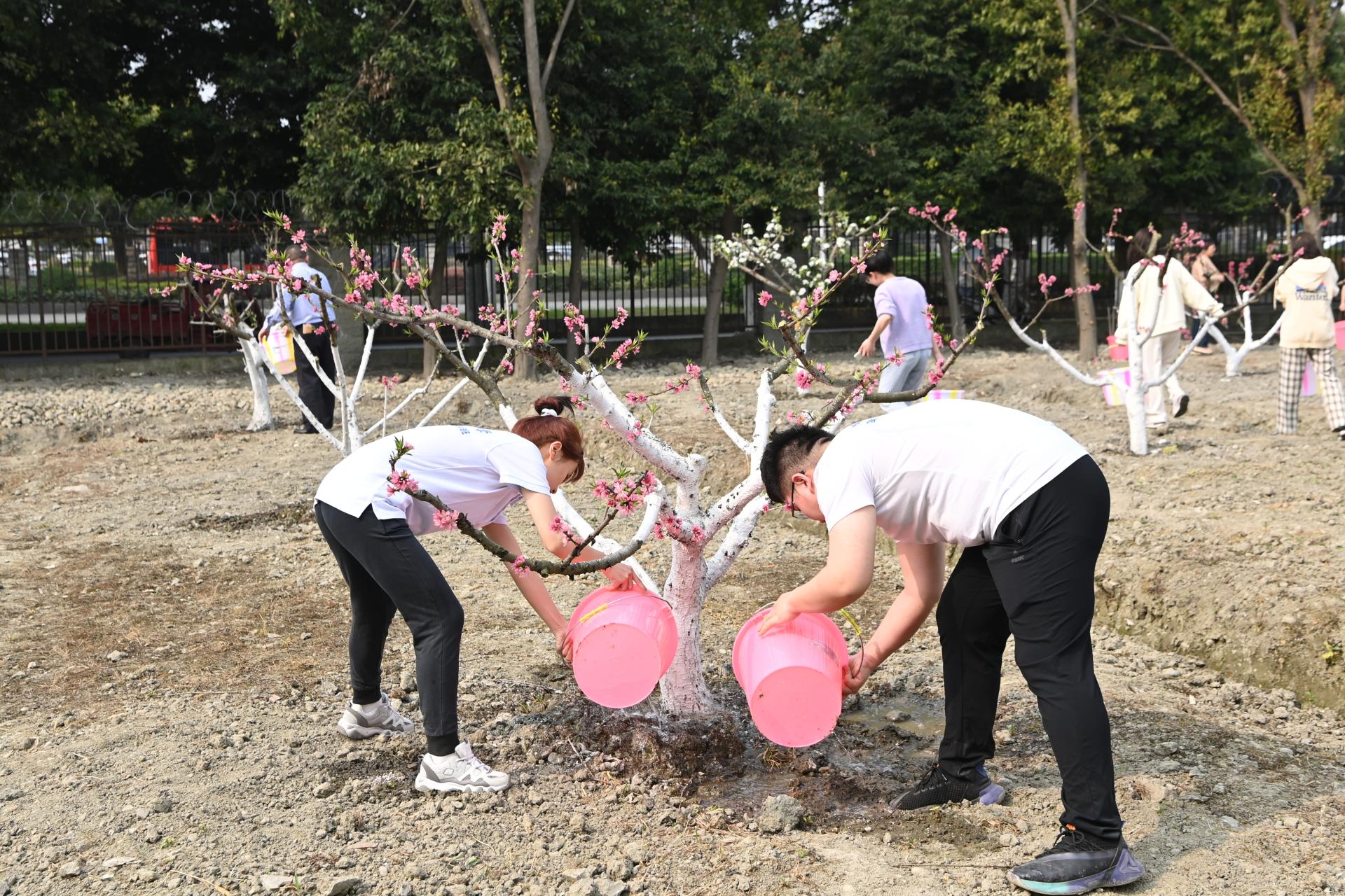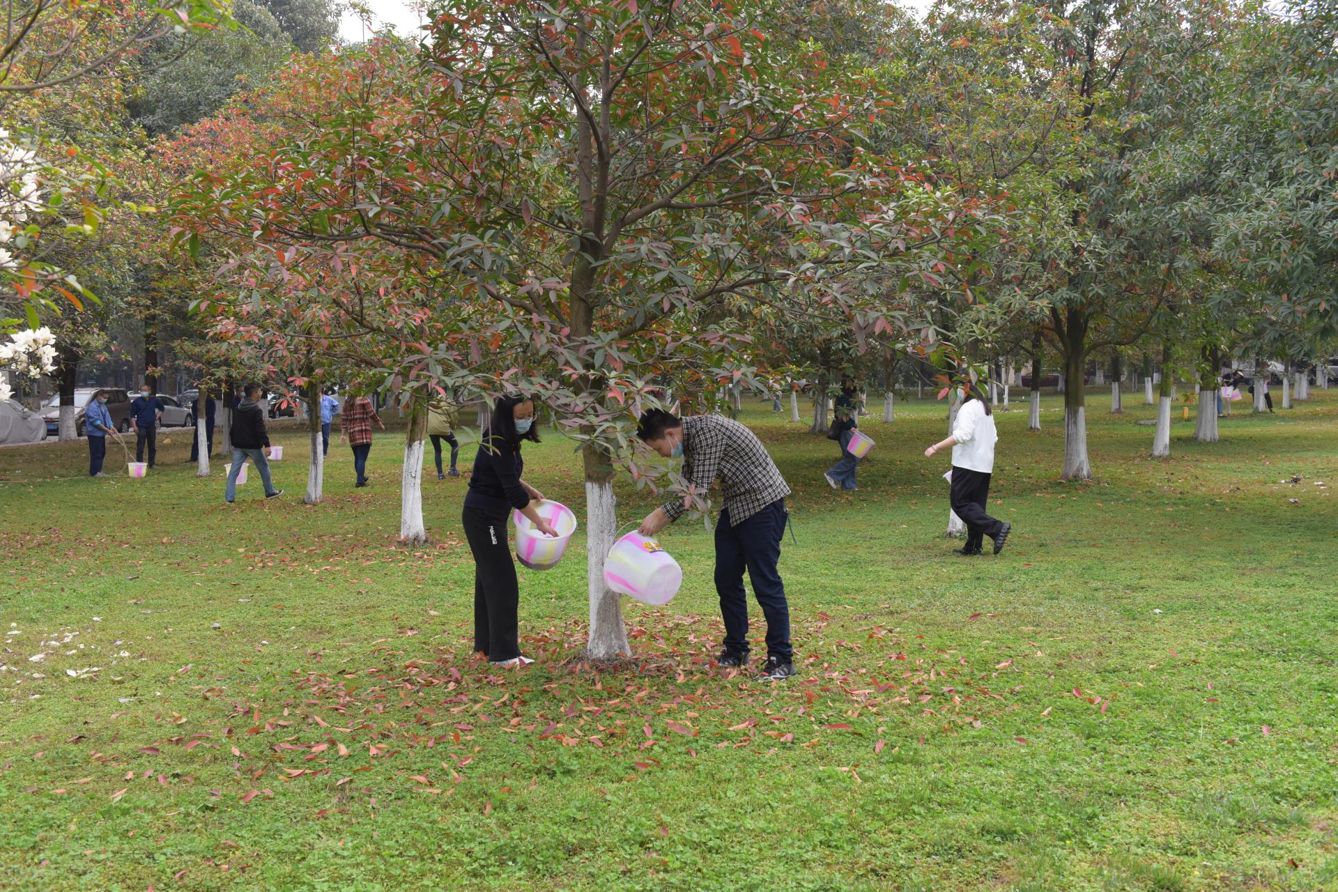 下午三點半,喬木澆水施肥活動在“耕讀田園”果蔬種植勞動實踐基地及光華樓西側草坪舉行,旨在以春季樹木養護為載體,引導師生愛護草木、珍愛綠色,培養師生喬木養護技能。在校領導的帶領下,師生們擼起袖子拎起水桶,一趟趟奔忙在樹林間,有的取水拎水、有的澆根施肥,勞動現場有條不紊,一片熱火朝天的繁忙景象。經過一個多小時的通力協作,約7000㎡200余棵喬木的澆水護樹任務順利完成。