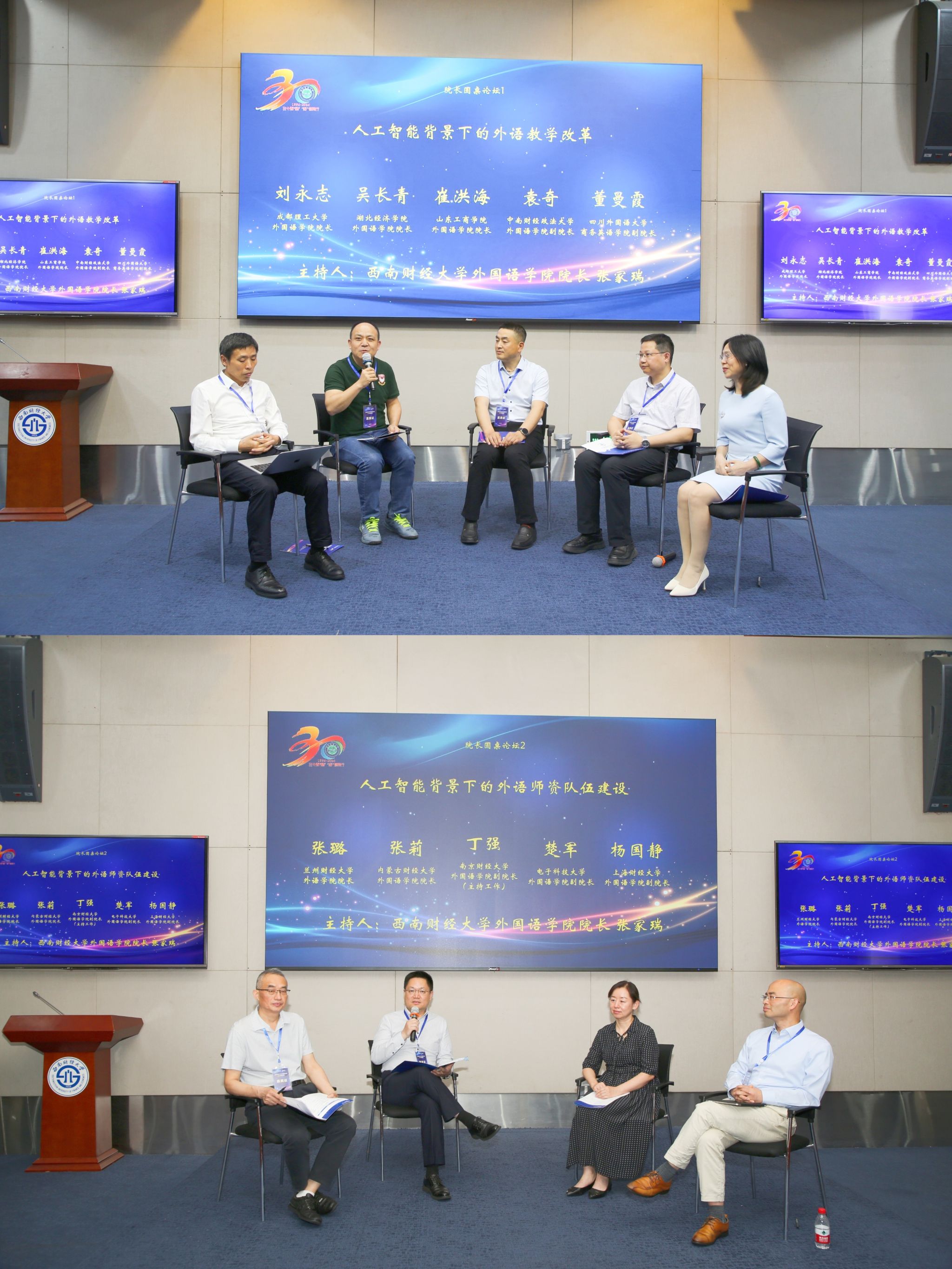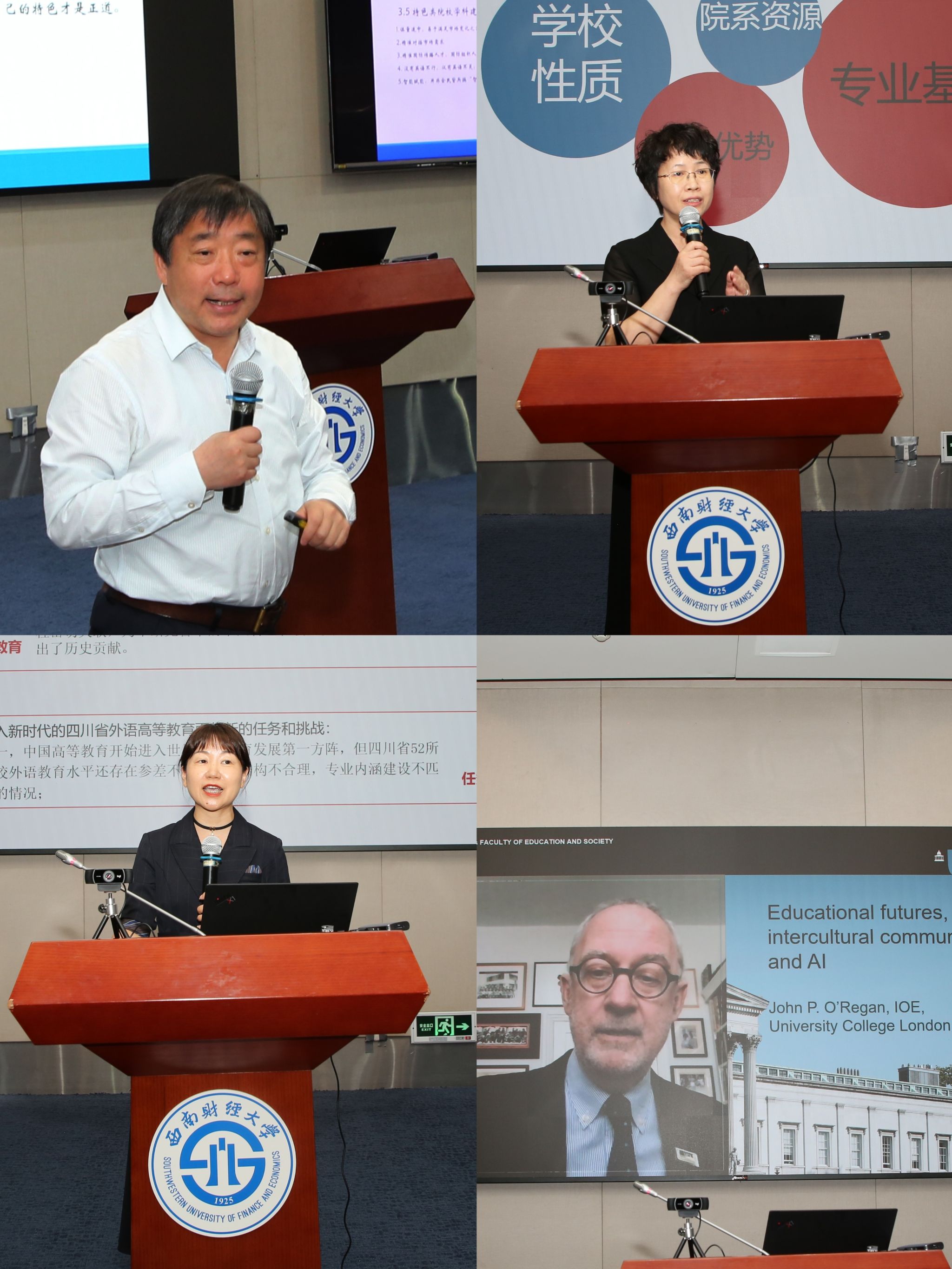 開幕式結束后,舉行以“‘新財經’戰略升級背景下的外語教學與人才培養”為主題的院長論壇。主旨報告環節,廈門大學外文學院院長陳菁、四川大學外國語學院院長王欣、對外經濟貿易大學英語學院院長向明友、北京語言大學國別和區域研究院院長羅林、UCL教育學院副院長John O' Regan分別圍繞“一流本科專業建設特色發展的內在理路和外在呈現”“外語類拔尖創新人才培養研究”“強國建設背景下特色專科學校外語學科建設和專業人才培養”“賦能區域國別研究,大力培養‘新財經’復合型外語人才”和“教育未來、跨文化交流與人工智能”分別進行發言。院長圓桌論壇主要圍繞“人工智能背景下的外語教學改革”與“人工智能背景下的外語師資隊伍建設”展開探討。
