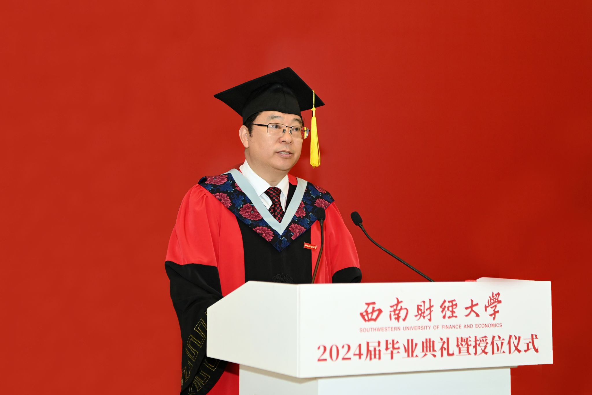趙建軍主持典禮時(shí)指出,“經(jīng)世濟(jì)民、孜孜以求”的西財(cái)精神,既蘊(yùn)含著一所大學(xué)“教育報(bào)國(guó)”的崇高使命,又飽含著全體師生“愛國(guó)奉獻(xiàn)”的信念追求,還彰顯著財(cái)經(jīng)學(xué)科的底蘊(yùn)特色,是每一名西財(cái)人奮進(jìn)拼搏的思想源泉和不竭動(dòng)力。他深情勉勵(lì)畢業(yè)生在今后的人生之路上傳承好西財(cái)精神,做行動(dòng)派、當(dāng)實(shí)干家,在強(qiáng)國(guó)建設(shè)、民族復(fù)興偉業(yè)中貢獻(xiàn)西財(cái)青春力量。趙建軍寄語西財(cái)青年,要樹立“經(jīng)世報(bào)國(guó)”的遠(yuǎn)大志向,以理想為帆、奮斗為槳,堅(jiān)定不移聽黨話、跟黨走,把準(zhǔn)人生方向,積極投身強(qiáng)國(guó)建設(shè)、民族復(fù)興偉業(yè),在“強(qiáng)國(guó)有我”的實(shí)踐中不斷提高本領(lǐng)能力,自覺在以中國(guó)式現(xiàn)代化全面推進(jìn)中華民族偉大復(fù)興的嶄新征程中挺膺擔(dān)當(dāng)。要厚植“濟(jì)民安邦”的為民情懷,涵養(yǎng)“我將無我”的境界、扛牢“不負(fù)人民”的責(zé)任,堅(jiān)持人民至上,在工作崗位上深入基層、深入群眾,既向人民群眾學(xué)習(xí),更解決他們的急難愁盼問題,自覺做到民之所憂,我必念之;民之所盼,我必行之。要錘煉“孜孜以求”的堅(jiān)韌品格,以奔騰不息的動(dòng)力、上下求索的毅力,干一行、愛一行、鉆一行,勇于做先鋒、當(dāng)闖將,在急難險(xiǎn)重中強(qiáng)壯筋骨,在摸爬滾打中增長(zhǎng)才干,迎難而上、艱苦奮斗、堅(jiān)韌不拔,一步一個(gè)腳印,在新時(shí)代新征程上留下無悔的青春足跡。