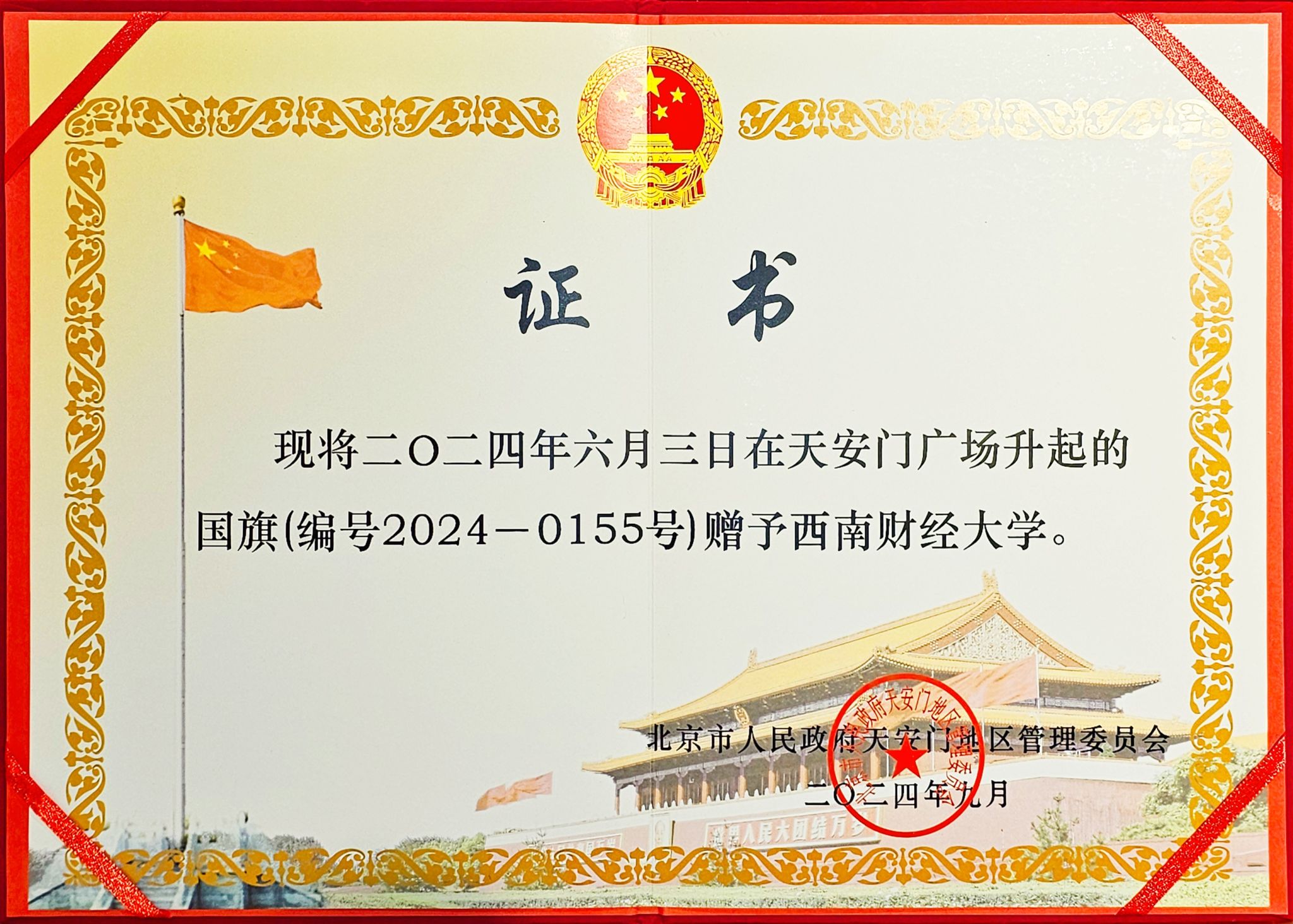 在天安門廣場升掛過的國旗具有唯一性,十分珍貴。這面編號為2024-0155的國旗于2024年6月3日在天安門廣場升起,正值西南財經(jīng)大學(xué)建校99周年,對于學(xué)校意義非凡。天安門地區(qū)管理委員會將這面國旗贈予學(xué)校,是對學(xué)校即將迎來百年華誕的衷心祝賀、對學(xué)校近百年輝煌成就的贊譽肯定,更是對學(xué)校事業(yè)發(fā)展的巨大鼓舞和極大鞭策。