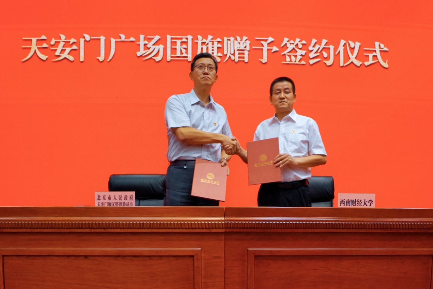 儀式上,姚輝、明海峰代表雙方簽署天安門廣場國旗贈予協(xié)議,趙建軍代表學(xué)校迎領(lǐng)國旗。鮮艷的五星紅旗平整地疊放在刻有“中華人民共和國國旗”字樣的檀木箱中,大五角星居中朝上,熠熠生輝。西南財經(jīng)大學(xué)國旗班成員鄭重接過檀木箱,莊嚴護旗并展示國旗,與會人員向國旗行注目禮。濃烈的愛國情報國志伴隨著現(xiàn)場經(jīng)久不息的掌聲激蕩心間。