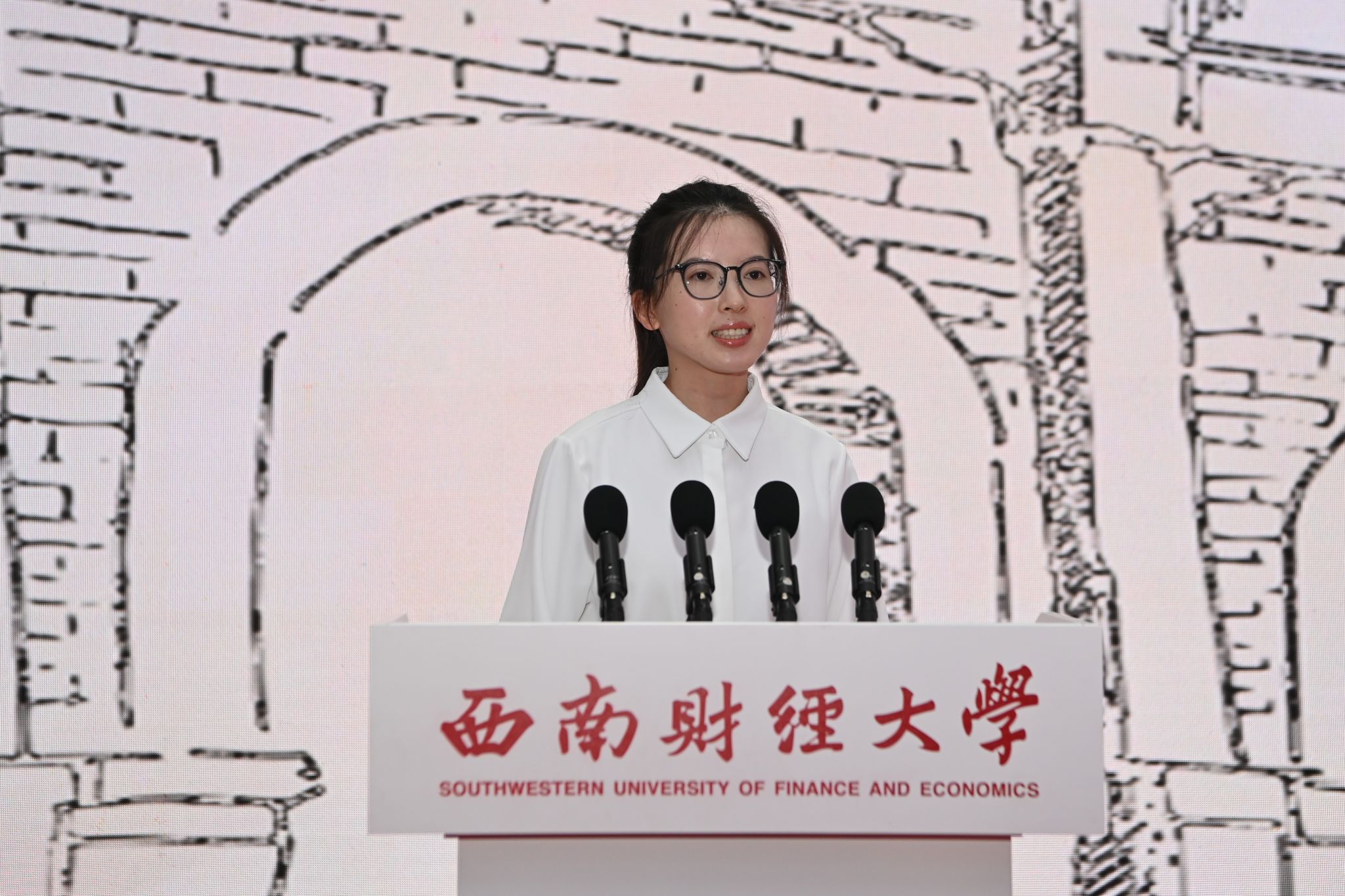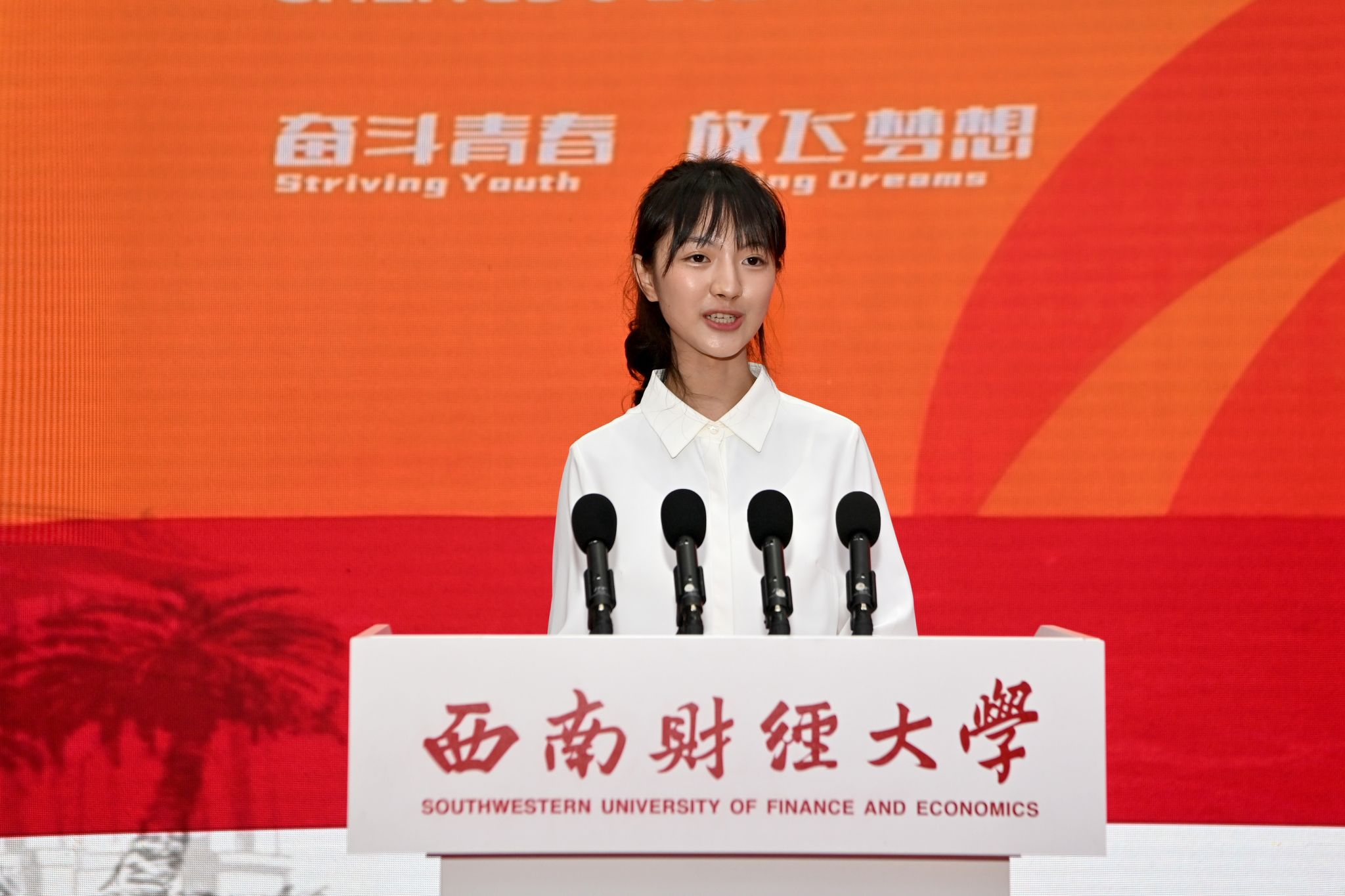 受表彰三好學生代表俞佳琦、優秀學生干部代表陳雨童、先進班集體班長代表陳健宇結合自身學習生活經歷進行先進事跡分享交流,號召廣大西財青年傳承“經世濟民、孜孜以求”之精神,秉承“嚴謹、勤儉、求實、開拓”之校訓,在星辰大海征程中追逐夢想,讓青春為中國式現代化挺膺擔當。