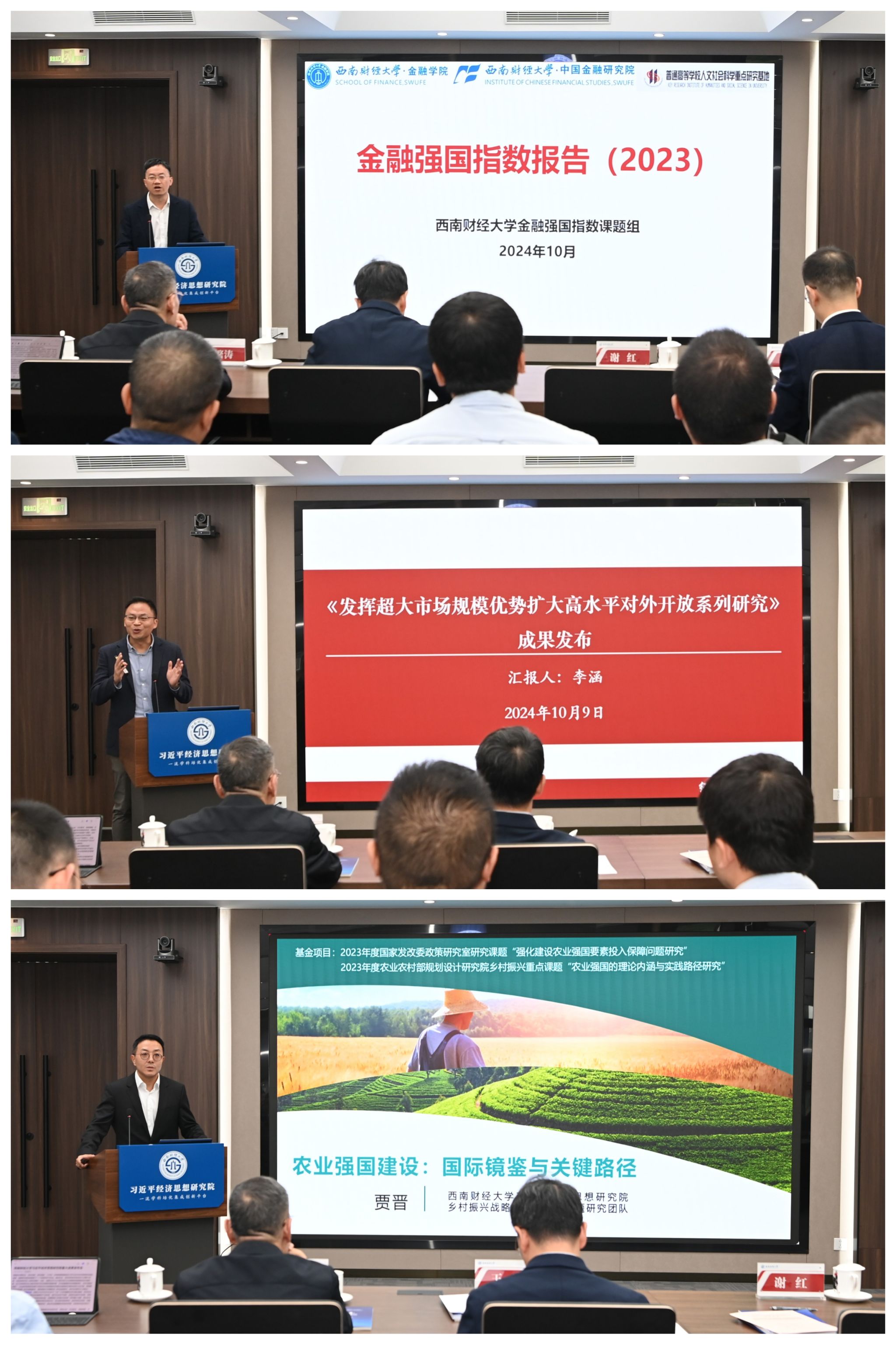 發布會上,學校中國金融研究院副院長董青馬代表中國特色現代金融(保險)理論體系研究團隊發布《金融強國指數報告》研究成果;工商管理學院院長李涵代表新發展格局與高水平對外開放研究團隊發布《發揮超大市場規模優勢擴大高水平對外開放系列研究》研究成果;習近平經濟思想研究院副院長賈晉代表鄉村振興戰略與“三農”問題研究團隊發布《農業強國建設:國際鏡鑒與關鍵路徑》研究成果。