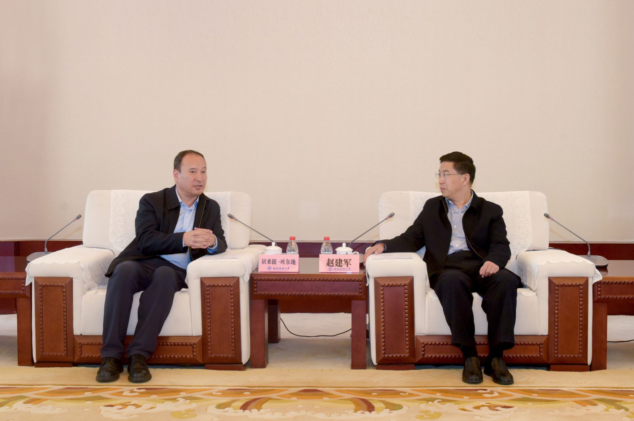 趙建軍對居來提·吐爾地一行來訪表示熱烈歡迎,并簡要介紹了西南財經大學的發展情況。他表示,學校黨委高度重視援疆工作,兩校同為西部地區財經類高校,希望雙方持續加強聯系,攜手并進,共同為西部地區發展貢獻財經高校力量。