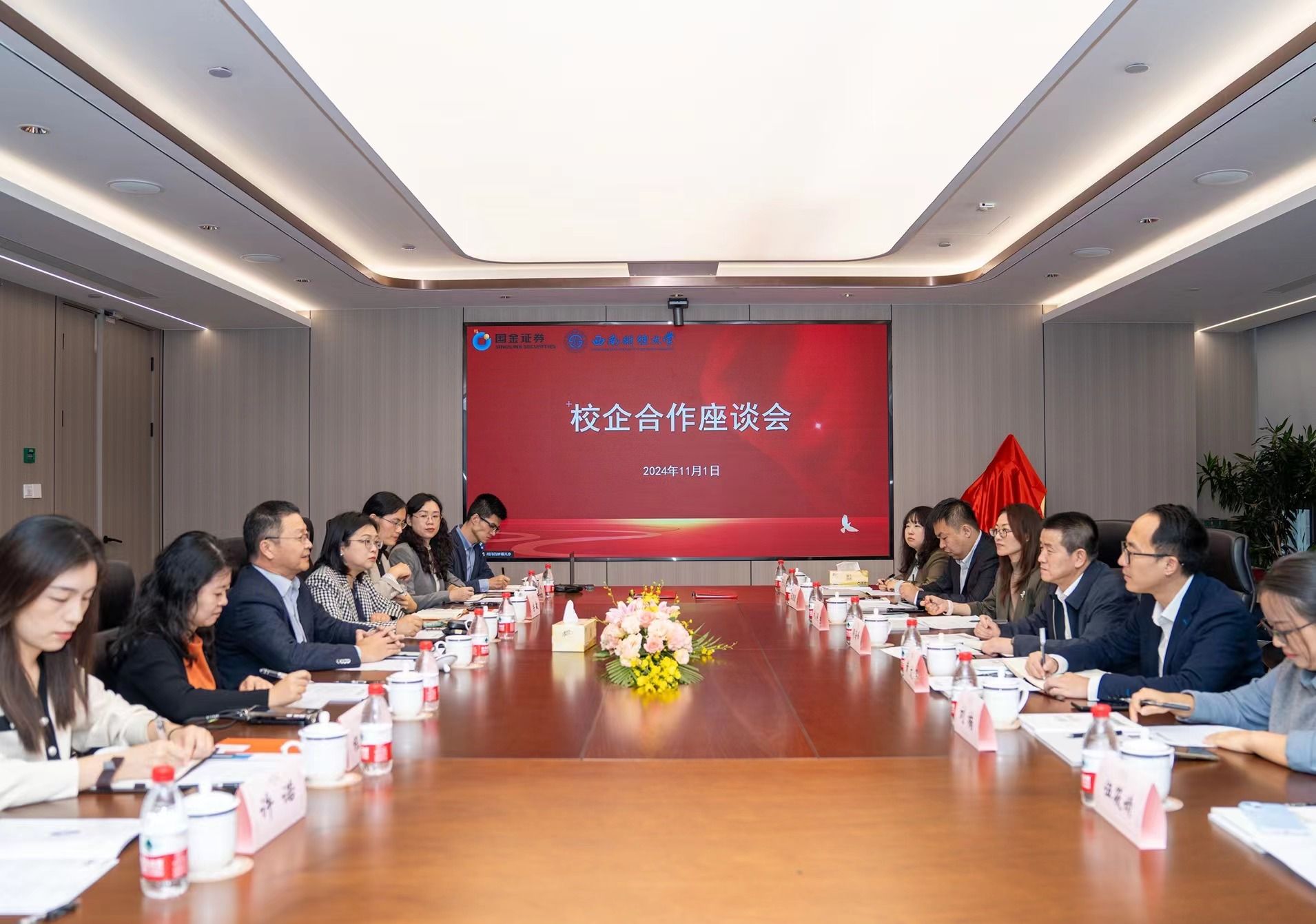 11月1日,明海峰一行前往上海國(guó)金證券有限公司走訪并看望校友。國(guó)金證券黨委副書記、總裁姜文國(guó)和國(guó)金證券總部相關(guān)部門負(fù)責(zé)人、校友代表參加座談。雙方圍繞人才培養(yǎng)、實(shí)習(xí)實(shí)踐、人才招聘、企業(yè)案例開(kāi)發(fā)、課程共建、聯(lián)合研究等領(lǐng)域達(dá)成合作意愿和共識(shí),并舉行實(shí)習(xí)基地揭牌和校企合作簽約儀式。