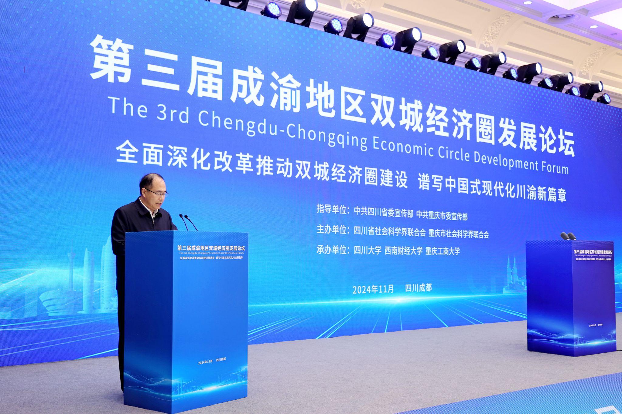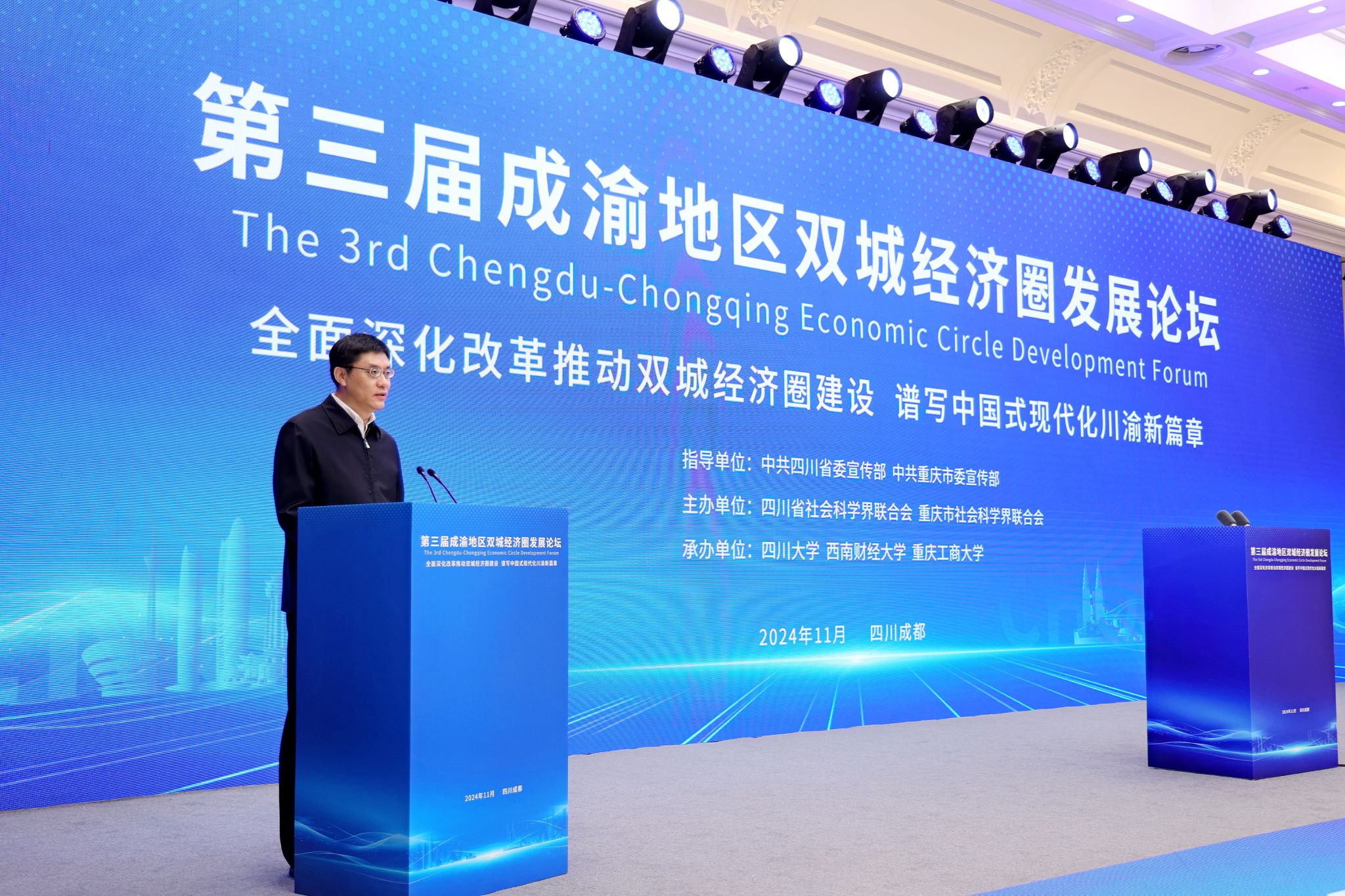 11月13日,由四川省委宣傳部、重慶市委宣傳部指導,四川省社科聯(lián)和重慶市社科聯(lián)聯(lián)合主辦,四川大學、西南財經大學、重慶工商大學聯(lián)合承辦的“第三屆成渝地區(qū)雙城經濟圈發(fā)展論壇”在成都舉行。四川省委常委、宣傳部部長、省社科聯(lián)主席鄭莉宣布論壇開幕。四川省人民政府副省長胡云,重慶市委常委、宣傳部部長、市社科聯(lián)主席姜輝出席并致辭。西南財經大學黨委書記趙建軍主持主旨報告。