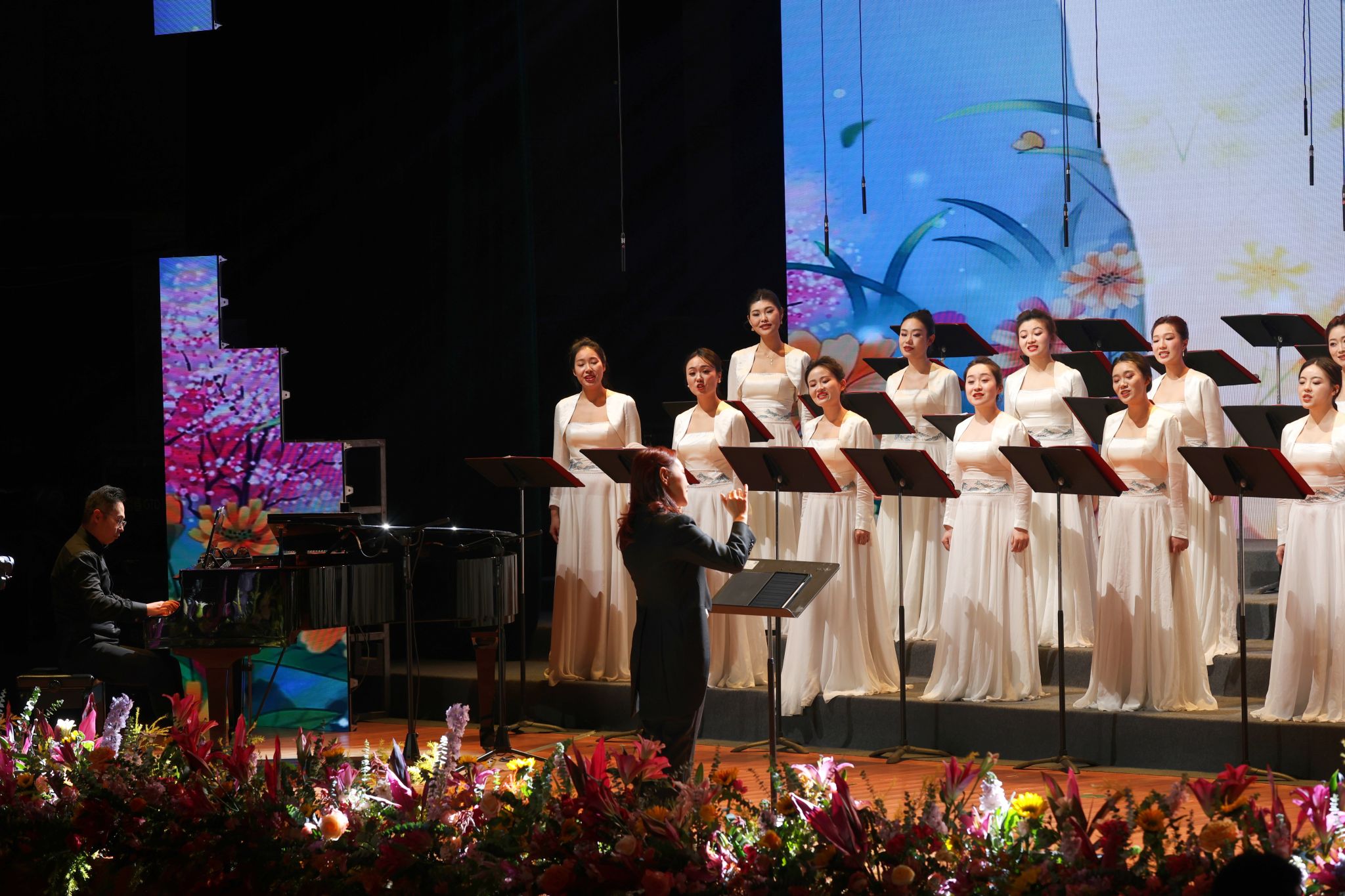 本場新年音樂會特邀四川交響樂團合唱團傾情演繹。在青年指揮家柳秀妍、鋼琴伴奏曾亮的指揮彈奏中,混聲合唱《上春山》拉開序幕,輕快的旋律和精湛的演唱瞬間點燃現場氛圍。隨后,混聲合唱、女聲合唱、男聲合唱等多種演唱形式依次上演,每一首歌曲都以其獨特的魅力和深刻的內涵,贏得了現場觀眾陣陣掌聲。