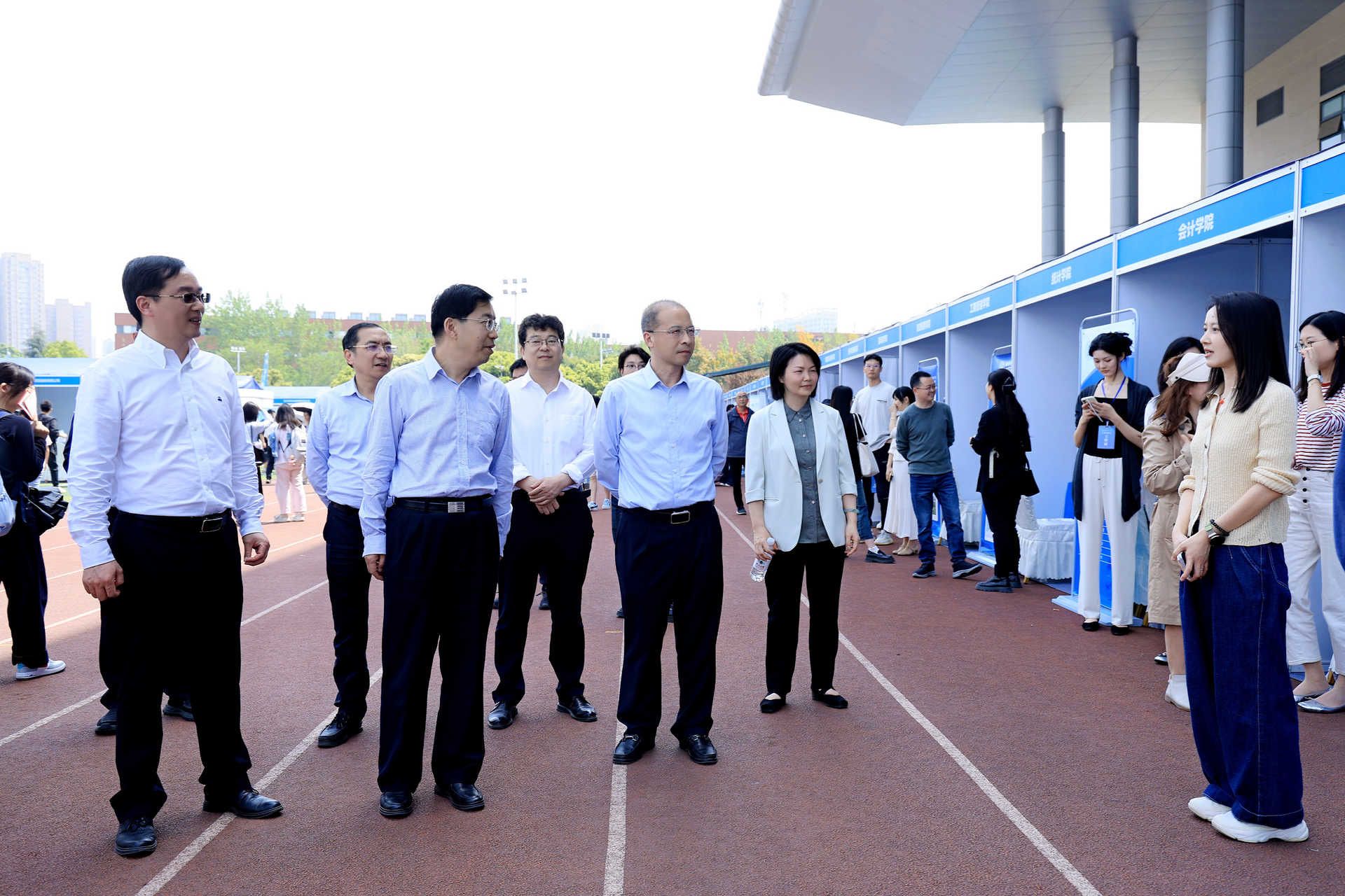 校領導趙建軍、李永強、孫殿明、謝紅、史代敏、王擎來到雙選會現場,與用人單位深入交流,了解行業人才需求趨勢,聽取用人單位對學校人才培養意見建議。校領導與求職學生親切互動,詢問求職進展,鼓勵畢業生把握機遇、樹立信心,主動服務國家戰略。