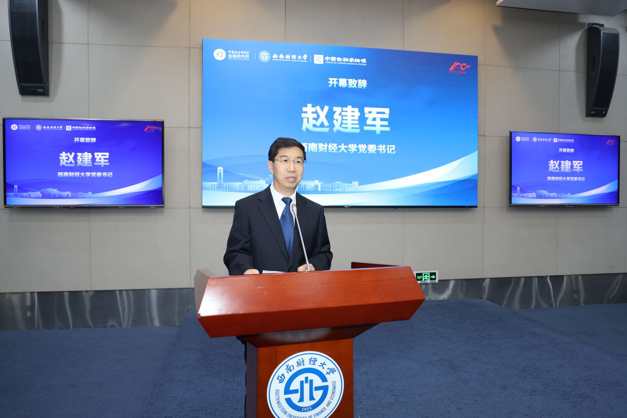 學校黨委書記趙建軍在開幕式致辭。他指出,西南財經大學始終與國家發展同頻共振,近年來更通過組建“習近平經濟思想研究院”、開展金融科技聯合培養、發布“金融強國指數”等持續提升金融人才自主培養能力、積極構建中國金融學自主知識體系,以系列務實舉措服務金融強國建設,期待嘉賓圍繞論壇主題深入交流,為中國金融學發展注入新動力。