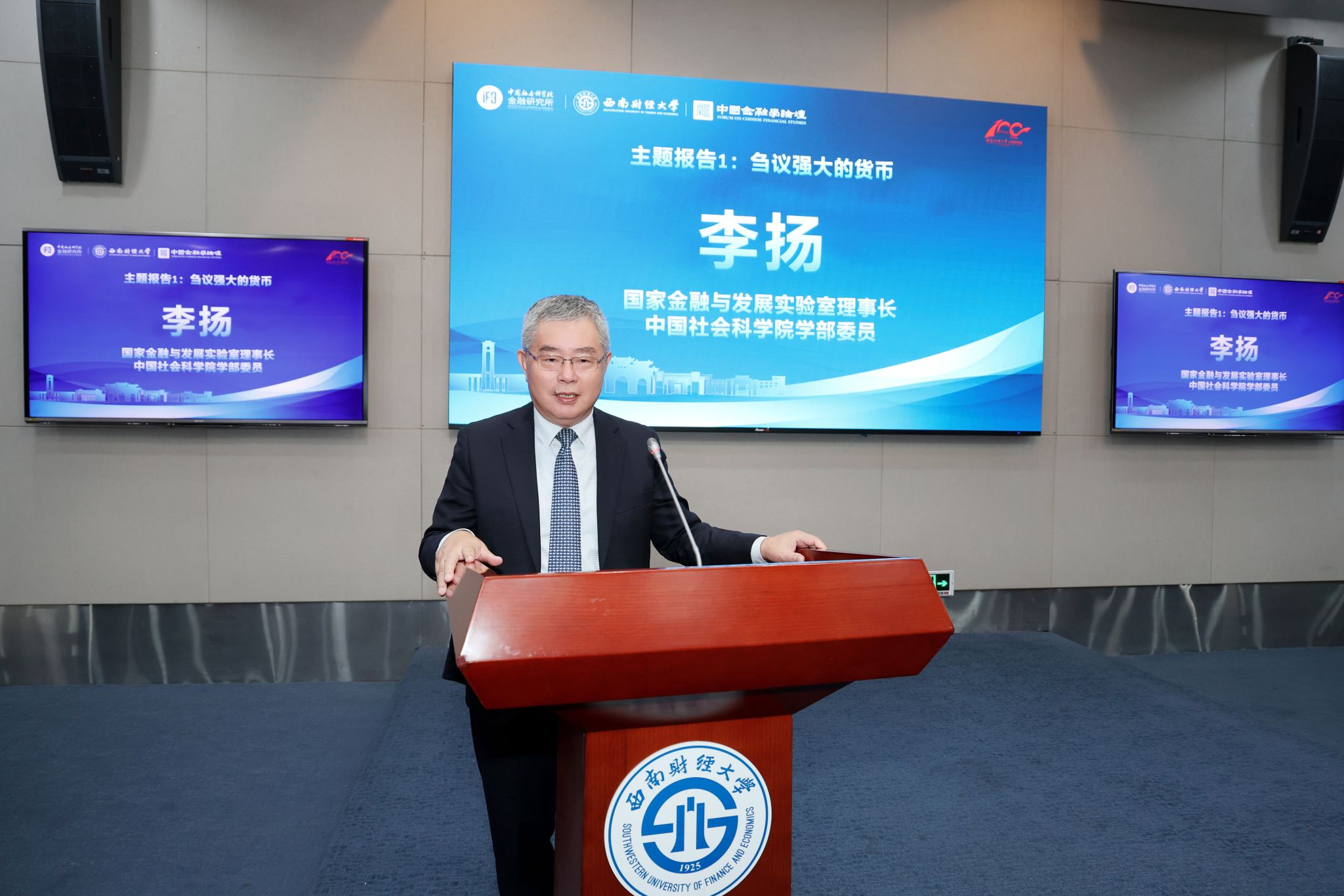 國家金融與發展實驗室理事長、中國社會科學院學部委員李揚和中國人民大學國家金融研究院院長、中國資本市場研究院院長、一級教授吳曉求分別圍繞“芻議強大的貨幣”和“硬實力與軟實力:中國實現金融強國的兩大支柱”進行主旨演講。學校黨委常委、副校長李志生、王擎分別主持了主旨演講和開幕式。